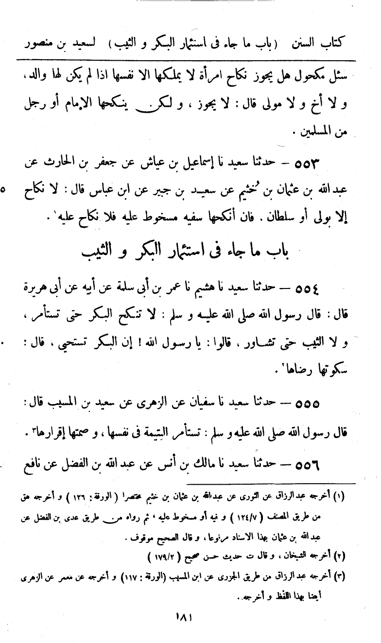 554 - حَدَّثَنَا سَعِيدٌ، نا هُشَيْمٌ، نا عُمَرُ بْنُ أَبِي سَلَمَةَ، عَنْ أَبِيهِ، عَنْ أَبِي هُرَيْرَةَ قَالَ: قَالَ رَسُولُ اللَّهِ صَلَّى اللهُ عَلَيْهِ وَسَلَّمَ: «§لَا تُنْكَحُ الْبِكْرُ حَتَّى تُسْتَأْمَرَ، وَلَا الثَّيِّبُ حَتَّى تُشَاوَرَ» . قَالُوا: يَا رَسُولَ اللَّهِ، إِنَّ الْبِكْرَ تَسْتَحْيِي. قَالَ: «سُكُوتُهَا رِضَاهَا»