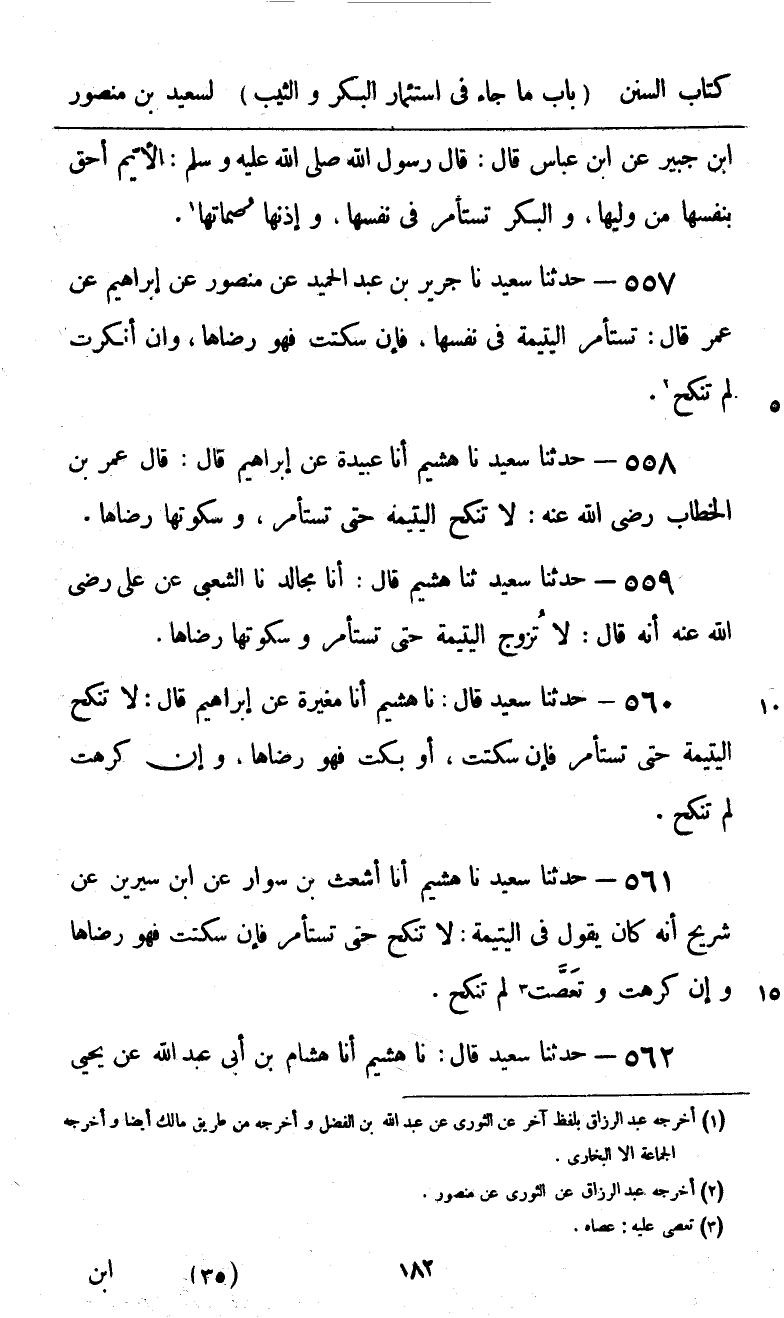 558 - حَدَّثَنَا سَعِيدٌ، نا هُشَيْمٌ، أنا عُبَيْدَةُ، عَنْ إِبْرَاهِيمَ قَالَ: قَالَ عُمَرُ بْنُ الْخَطَّابِ رَضِيَ اللَّهُ عَنْهُ: «§لَا تُنْكَحُ الْيَتِيمَةُ حَتَّى تُسْتَأْمَرَ، وَسُكُوتُهَا رِضَاهَا»