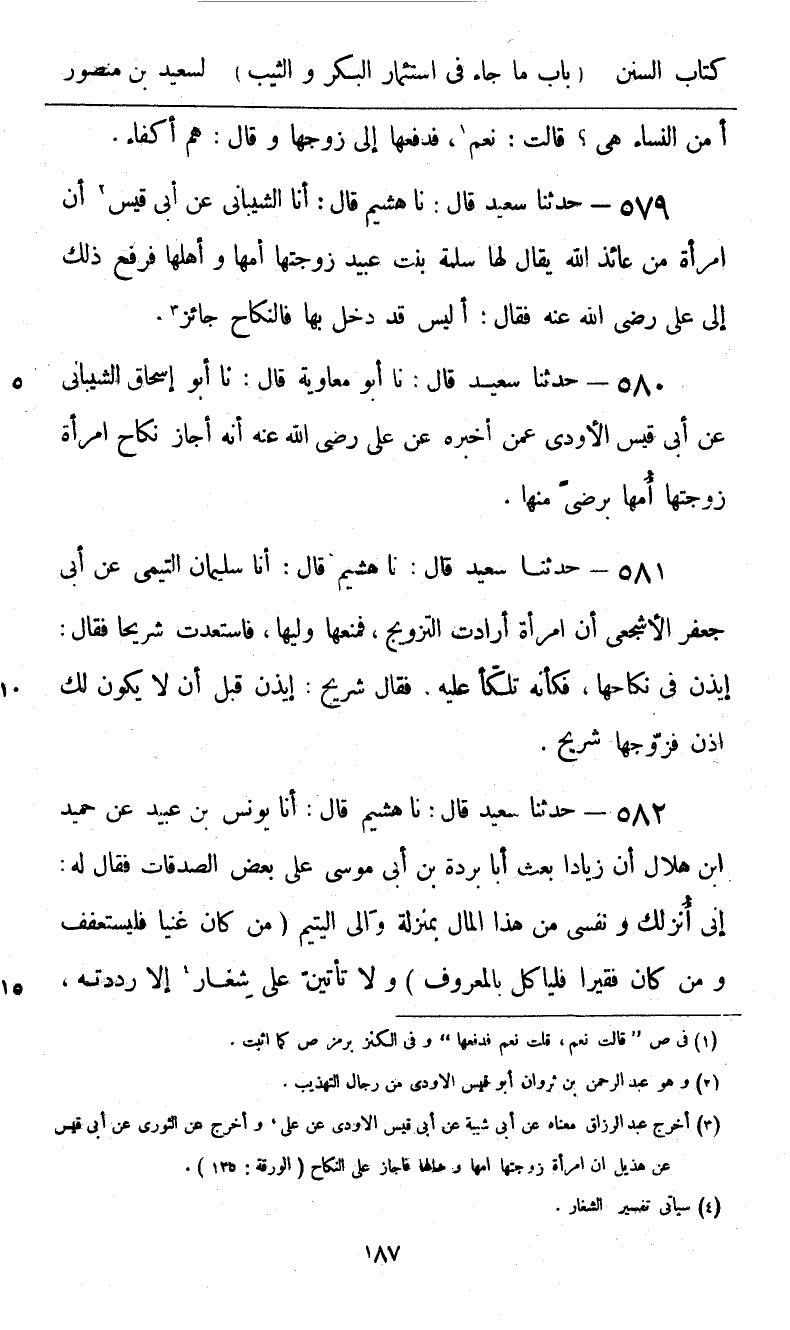 579 - حَدَّثَنَا سَعِيدٌ قَالَ: نا هُشَيْمٌ، قَالَ: أنا الشَّيْبَانِيُّ، عَنْ أَبِي قَيْسٍ، أَنَّ امْرَأَةً مِنْ عَائِذِ اللَّهِ يُقَالُ لَهَا سَلَمَةُ بِنْتُ عُبَيْدٍ زَوَّجَتْهَا أُمُّهَا وَأَهْلُهَا، فَرُفِعَ ذَلِكَ إِلَى عَلِيٍّ رَضِيَ اللَّهُ عَنْهُ، فَقَالَ: «أَلَيْسَ قَدْ دَخَلَ بِهَا؟ §فَالنِّكَاحُ جَائِزٌ»