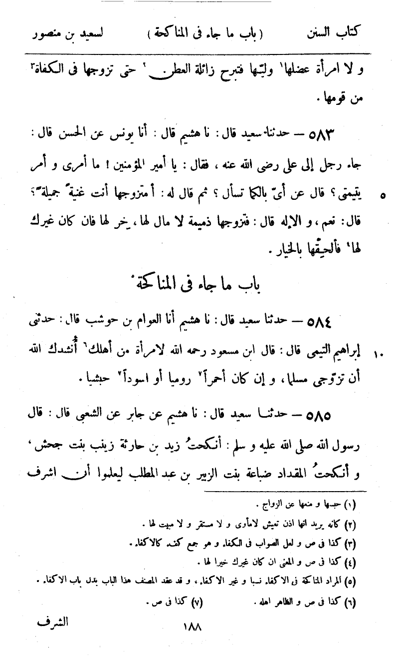 585 - حَدَّثَنَا سَعِيدٌ قَالَ: نا هُشَيْمٌ، عَنْ جَابِرٍ، عَنِ الشَّعْبِيِّ قَالَ: قَالَ رَسُولُ اللَّهِ صَلَّى اللهُ عَلَيْهِ وَسَلَّمَ: «§أَنْكَحْتُ زَيْدَ بْنَ حَارِثَةَ زَيْنَبَ بِنْتَ جَحْشٍ، وَأَنْكَحْتُ الْمِقْدَادَ ضُبَاعَةَ بِنْتَ الزُّبَيْرِ بْنِ عَبْدِ الْمُطَّلِبِ؛ لِيَعْلَمُوا أَنَّ أَشْرَفَ -[189]- الشَّرَفِ لِلْإِسْلَامِ»
