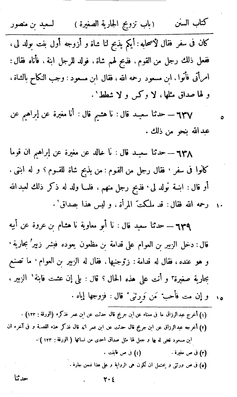 638 - حَدَّثَنَا سَعِيدٌ قَالَ: نا خَالِدٌ، عَنْ مُغِيرَةَ، عَنْ إِبْرَاهِيمَ، أَنَّ قَوْمًا كَانُوا فِي سَفَرٍ فَقَالَ رَجُلٌ مِنَ الْقَوْمِ: مَنْ يَذْبَحُ الشَّاةَ لِلْقَوْمِ؟ وَلَهُ ابْنَتِي، أَوْ قَالَ: ابْنَةٌ تُولَدُ لِي، فَذَبَحَ رَجُلٌ مِنْهُمْ، فَلَمَّا وُلِدَ لَهُ ذَكَرَ ذَلِكَ لِعَبْدِ اللَّهِ رَحِمَهُ اللَّهُ فَقَالَ: «§قَدْ مَلَكْتَ الْمَرْأَةَ وَلَيْسَ هَذَا بِصَدَاقٍ»