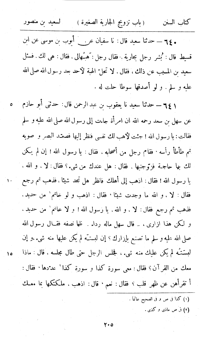 641 - حَدَّثَنَا سَعِيدٌ، نا يَعْقُوبُ بْنُ عَبْدِ الرَّحْمَنِ، قَالَ: حَدَّثَنِي أَبُو حَازِمٍ، عَنْ سَهْلِ بْنِ سَعْدٍ، رَحِمَهُ اللَّهُ " أَنَّ امْرَأَةً جَاءَتْ إِلَى رَسُولِ اللَّهِ صَلَّى اللهُ عَلَيْهِ وَسَلَّمَ فَقَالَتْ: يَا رَسُولَ اللَّهِ جِئْتُ لِأَهَبَ لَكَ نَفْسِي فَنَظَرَ إِلَيْهَا فَصَعَّدَ الْبَصَرَ وَصَوَّبَهُ ثُمَّ طَأْطَأَ رَأْسَهُ، فَقَامَ رَجُلٌ مِنْ أَصْحَابِهِ فَقَالَ: يَا رَسُولَ اللَّهِ، إِنْ لَمْ يَكُنْ لَكَ بِهَا حَاجَةٌ فَزَوِّجْنِيهَا، فَقَالَ: «هَلْ عِنْدَكَ مِنْ شَيْءٍ؟» فَقَالَ: لَا، وَاللَّهِ يَا رَسُولَ اللَّهِ فَقَالَ: «§اذْهَبْ إِلَى أَهْلِكَ فَانْظُرْ هَلْ تَجِدُ شَيْئًا» ، فَذَهَبَ ثُمَّ رَجَعَ فَقَالَ: لَا وَاللَّهِ مَا وَجَدْتُ شَيْئًا، فَقَالَ: «اذْهَبْ وَلَوْ خَاتَمًا مِنْ حَدِيدٍ» ، فَذَهَبَ ثُمَّ رَجَعَ فَقَالَ: لَا وَاللَّهِ يَا رَسُولَ اللَّهِ وَلَا خَاتَمًا مِنْ حَدِيدٍ وَلَكِنْ هَذَا إِزَارِي - مَا لَهُ رِدَاءٌ - فَلَهَا نِصْفُهُ، فَقَالَ رَسُولُ اللَّهِ صَلَّى اللهُ عَلَيْهِ وَسَلَّمَ: «مَا تَصْنَعُ بِإِزَارِكَ» ؟ إِنْ لَبِسْتَهُ لَمْ يَكُنْ عَلَيْهَا مِنْهُ شَيْءٌ، وَإِنْ لَبِسَتْهُ لَمْ يَكُنْ عَلَيْكَ مِنْهُ شَيْءٌ، فَجَلَسَ الرَّجُلُ حَتَّى طَالَ مَجْلِسُهُ قَالَ: «مَاذَا مَعَكَ مِنَ الْقُرْآنِ» ؟ فَقَالَ: مَعِي سُورَةُ كَذَا وَسُورَةُ كَذَا عَدَّدَهَا، فَقَالَ: «أَتَقْرَؤُهُنَّ عَنْ ظَهْرِ قَلْبٍ» ؟ فَقَالَ: نَعَمْ قَالَ: «اذْهَبْ مَلَّكْتُكَهَا بِمَا مَعَكَ -[206]- مِنَ الْقُرْآنِ»