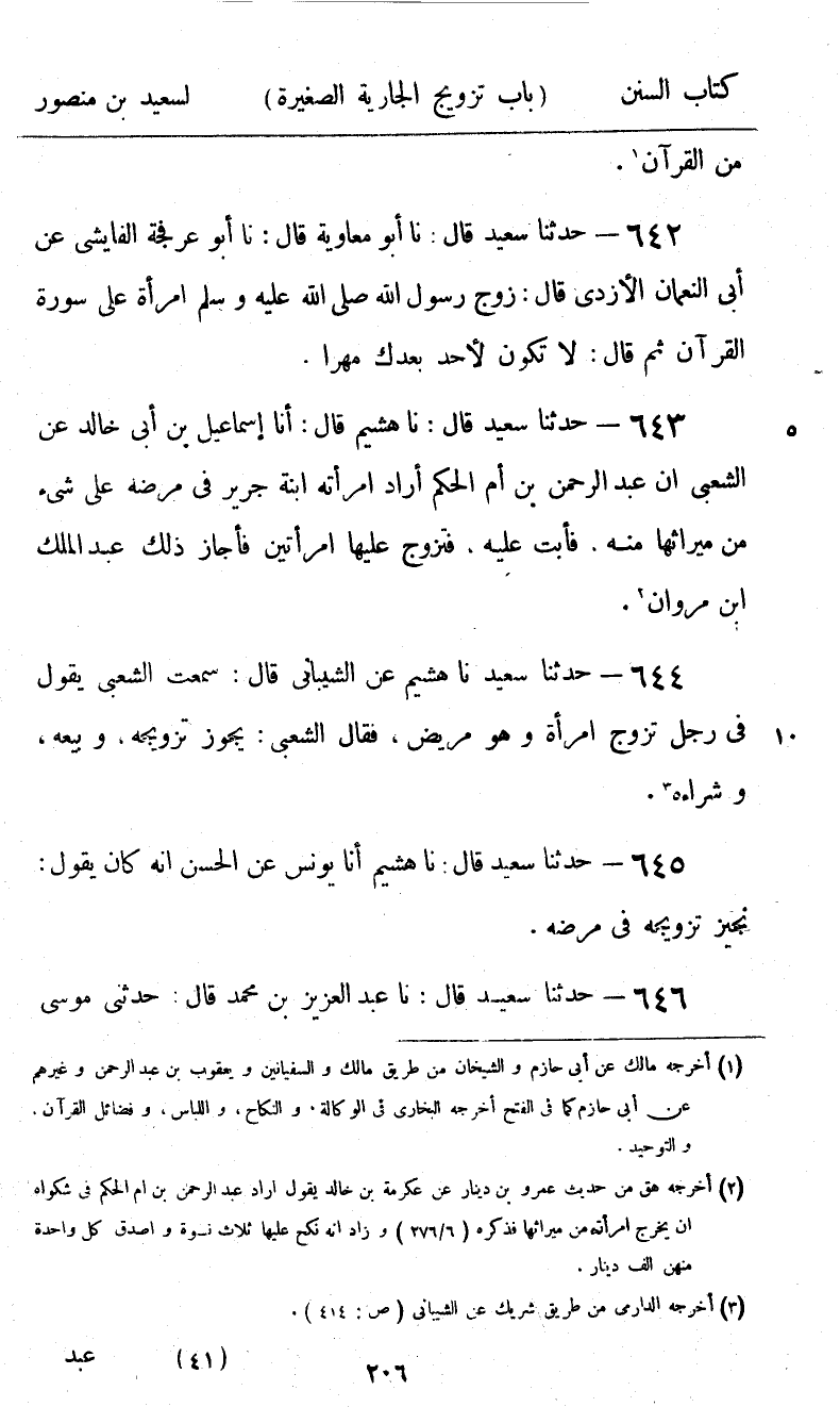 643 - حَدَّثَنَا سَعِيدٌ قَالَ: نا هُشَيْمٌ قَالَ: أنا إِسْمَاعِيلُ بْنُ أَبِي خَالِدٍ، عَنِ الشَّعْبِيِّ «أَنَّ عَبْدَ الرَّحْمَنِ بْنَ أُمِّ الْحَكَمِ §أَرَادَ امْرَأَتَهُ ابْنَةَ جَرِيرٍ فِي مَرَضِهِ عَلَى شَيْءٍ مِنْ مِيرَاثِهَا مِنْهُ فَأَبَتْ عَلَيْهِ، فَتَزَوَّجَ عَلَيْهَا امْرَأَتَيْنِ فَأَجَازَ ذَلِكَ عَبْدُ الْمَلِكِ بْنُ مَرْوَانَ»