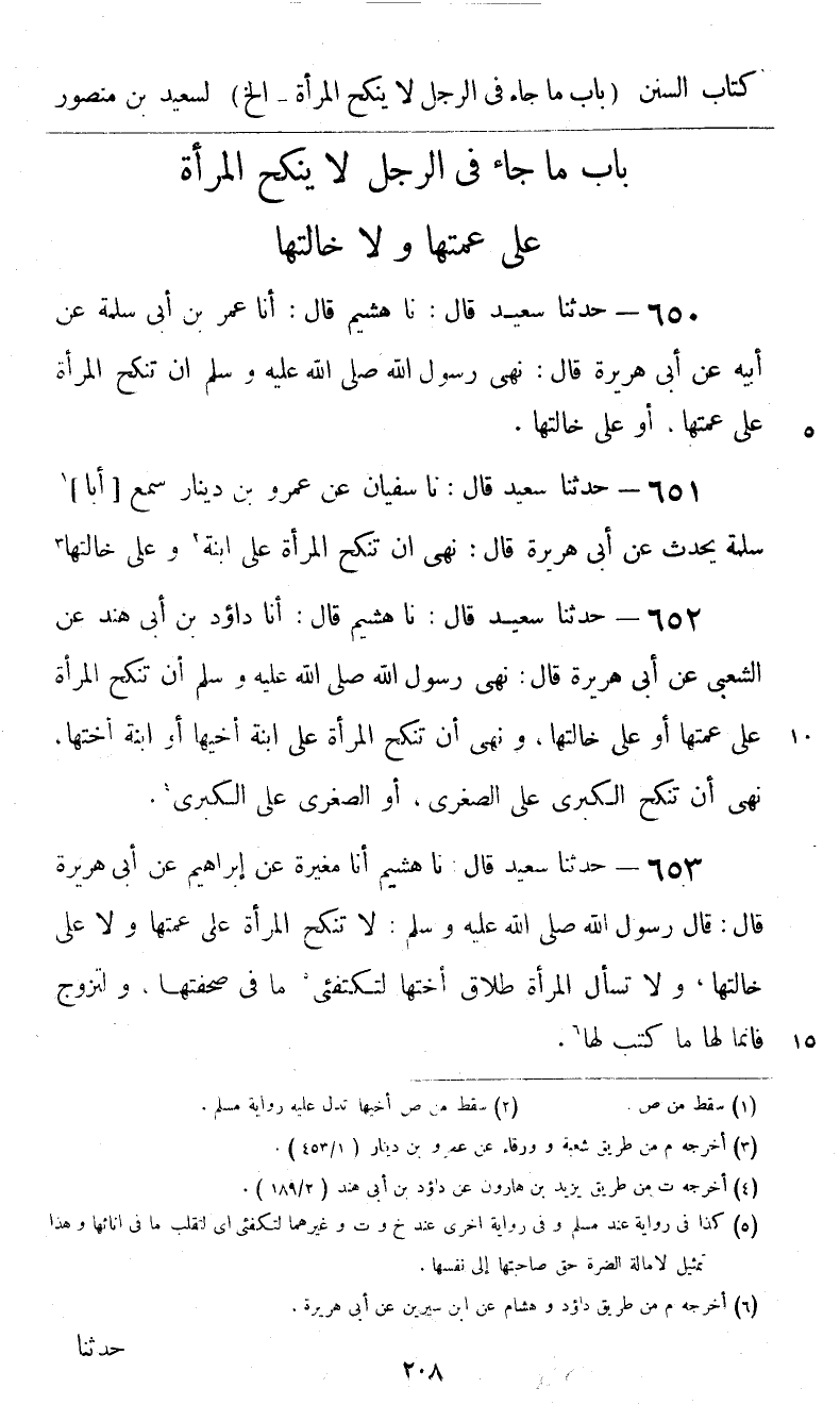 652 - حَدَّثَنَا سَعِيدٌ قَالَ: نا هُشَيْمٌ، قَالَ: أنا دَاوُدُ بْنُ أَبِي هِنْدَ، عَنِ الشَّعْبِيِّ، عَنْ أَبِي هُرَيْرَةَ، قَالَ: «§نَهَى رَسُولُ اللَّهِ صَلَّى اللهُ عَلَيْهِ وَسَلَّمَ أَنْ تُنْكَحَ الْمَرْأَةُ عَلَى عَمَّتِهَا أَوْ عَلَى خَالَتِهَا، وَنَهَى أَنْ تُنْكَحَ الْمَرْأَةُ عَلَى ابْنَةِ أَخِيهَا أَوِ ابْنَةِ أُخْتِهَا، نَهَى أَنْ تُنْكَحَ الْكُبْرَى عَلَى الصُّغْرَى، أَوِ الصُّغْرَى عَلَى الْكُبْرَى»