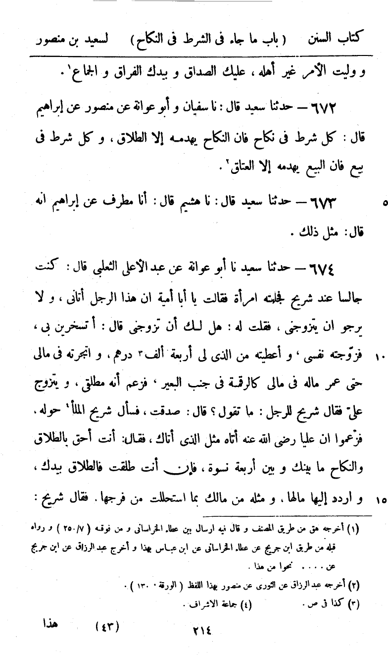 672 - حَدَّثَنَا سَعِيدٌ قَالَ: نا سُفْيَانُ، وَأَبُو عَوَانَةَ عَنْ مَنْصُورٍ، عَنْ إِبْرَاهِيمَ قَالَ: «§كُلُّ شَرْطٍ فِي نِكَاحٍ فَإِنَّ النِّكَاحَ يَهْدِمُهُ إِلَّا الطَّلَاقَ، وَكُلُّ شَرْطٍ فِي بَيْعٍ فَإِنَّ الْبَيْعَ يَهْدِمُهُ إِلَّا الْعِتَاقَ» .