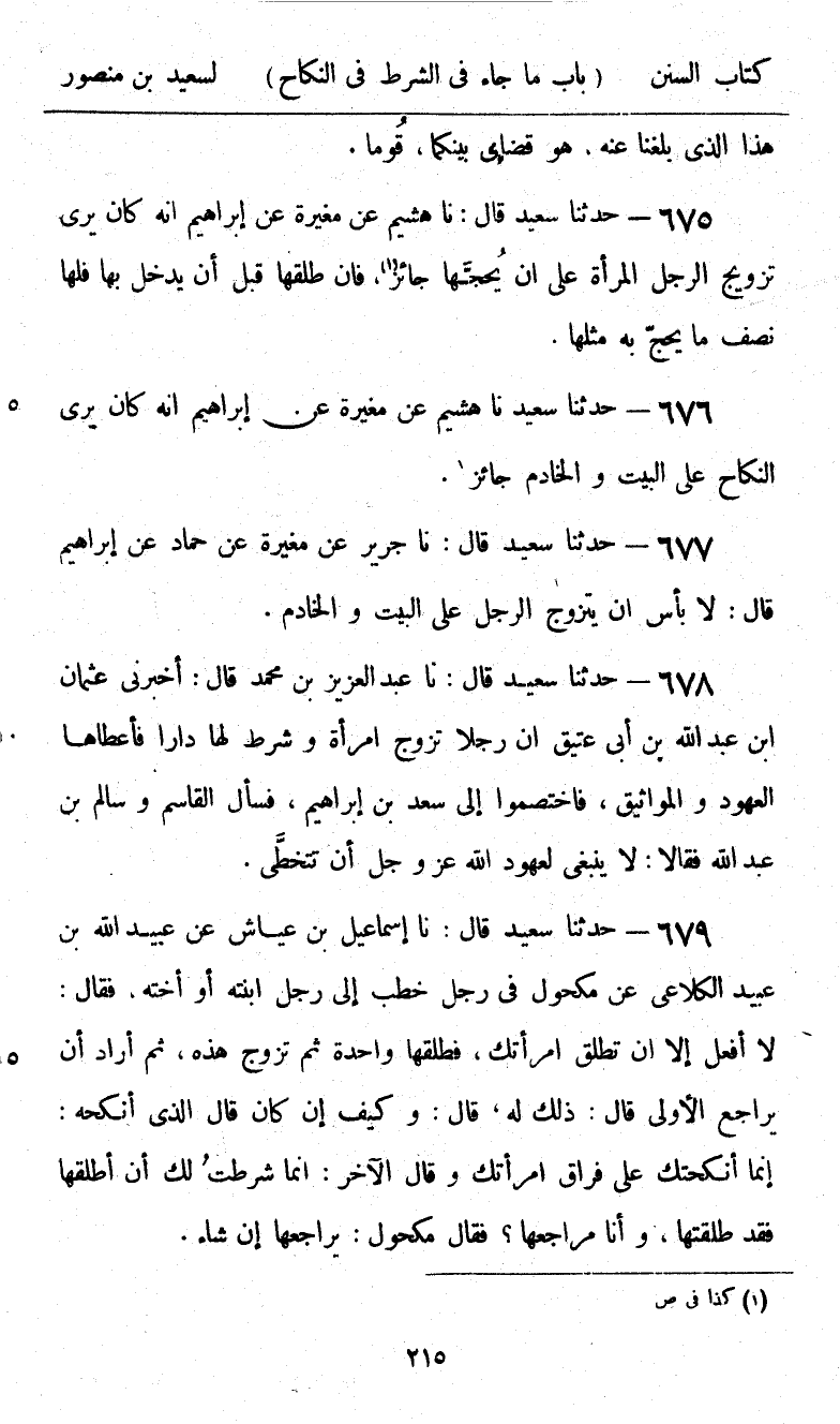 676 - حَدَّثَنَا سَعِيدٌ، نا هُشَيْمٌ، عَنْ مُغِيرَةَ، عَنْ إِبْرَاهِيمَ «أَنَّهُ §كَانَ يَرَى النِّكَاحَ عَلَى الْبَيْتِ وَالْخَادِمِ جَائِزًا»