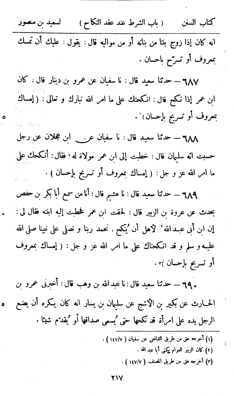 689 - حَدَّثَنَا سَعِيدٌ قَالَ: نا هُشَيْمٌ، قَالَ: أنا مَنْ سَمِعَ أَبَا بَكْرِ بْنَ حَفْصٍ يُحَدِّثُ عَنْ عُرْوَةَ بْنِ الزُّبَيْرِ قَالَ: لَحِقْتُ ابْنَ عُمَرَ فَخَطَبْتُ إِلَيْهِ ابْنَتَهُ، فَقَالَ لِي: " إِنَّ ابْنَ أَبِي عَبْدِ اللَّهِ لَأَهْلٌ أَنْ يُنْكِحَ، نَحْمَدُ رَبَّنَا وَنُصَلِّي عَلَى نَبِيِّنَا صَلَّى اللهُ عَلَيْهِ وَسَلَّمَ وَقَدْ §أَنْكَحْنَاكَ عَلَى مَا أَمَرَ اللَّهُ عَزَّ وَجَلَّ {إِمْسَاكٌ بِمَعْرُوفٍ أَوْ تَسْرِيحٌ بِإِحْسَانٍ}