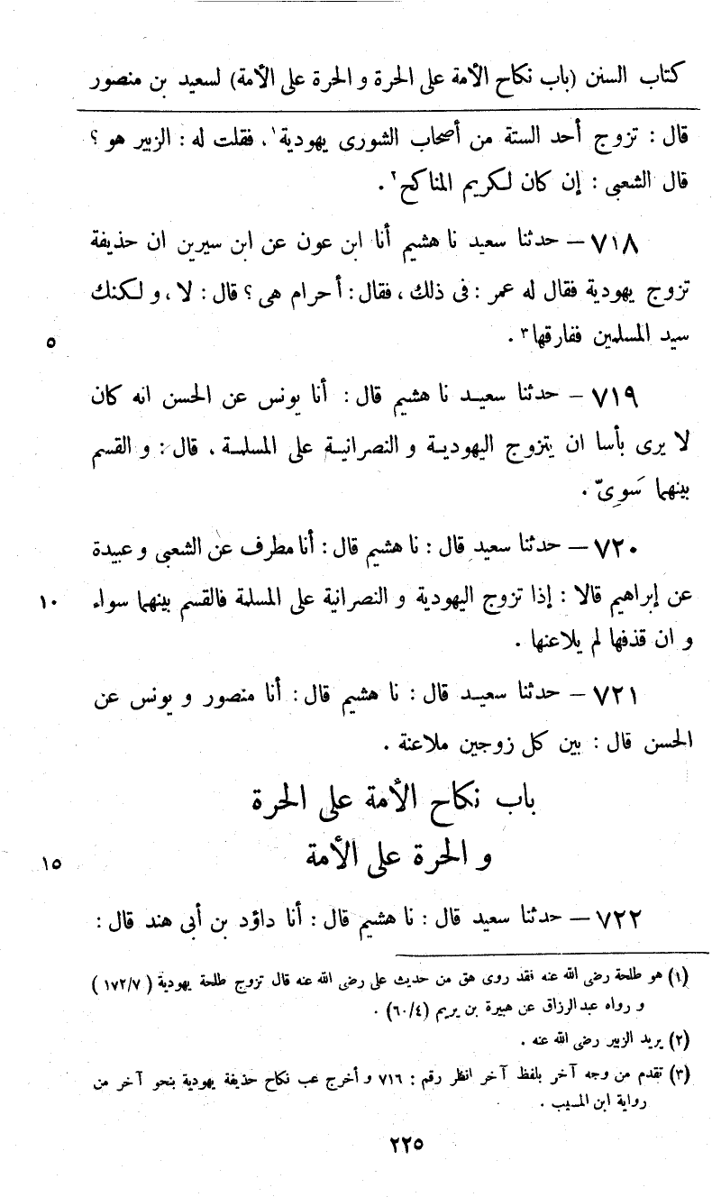 718 - حَدَّثَنَا سَعِيدٌ، نا هُشَيْمٌ أنا ابْنُ عَوْنٍ، عَنِ ابْنِ سِيرِينَ، أَنَّ حُذَيْفَةَ تَزَوَّجَ يَهُودِيَّةً فَقَالَ لَهُ عُمَرُ فِي ذَلِكَ، فَقَالَ: أَحَرَامٌ هِيَ؟ قَالَ: «لَا، §وَلَكِنَّكَ سَيِّدُ الْمُسْلِمِينَ فَفَارِقْهَا»