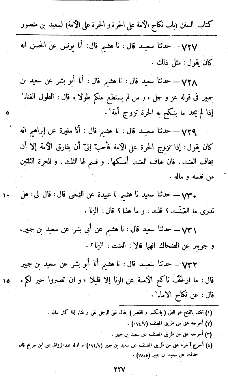 732 - حَدَّثَنَا سَعِيدٌ قَالَ: نا هُشَيْمٌ، أنا أَبُو بِشْرٍ، عَنْ سَعِيدِ بْنِ جُبَيْرٍ قَالَ: " §مَا ازْلَحَفَّ نَاكِحُ الْأَمَةِ عَنِ الزِّنَا إِلَّا قَلِيلًا {وَأَنْ تَصْبِرُوا خَيْرٌ لَكُمْ} [النساء: 25] قَالَ: عَنْ نِكَاحِ الْإِمَاءِ "