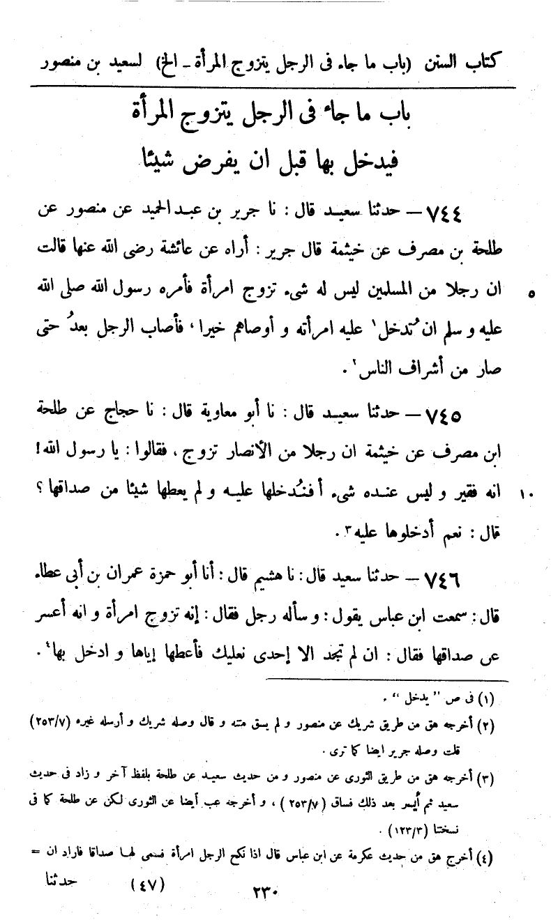 745 - حَدَّثَنَا سَعِيدٌ قَالَ: نا أَبُو مُعَاوِيَةَ قَالَ: نا حَجَّاجٌ، عَنْ طَلْحَةَ بْنِ مُصَرِّفٍ، عَنْ خَيْثَمَةَ، أَنَّ رَجُلًا مِنَ الْأَنْصَارِ تَزَوَّجَ فَقَالُوا: يَا رَسُولَ اللَّهِ إِنَّهُ فَقِيرٌ وَلَيْسَ عِنْدَهُ شَيْءٌ أَفَنُدْخِلُهَا عَلَيْهِ وَلَمْ يُعْطِهَا شَيْئًا مِنْ صَدَاقِهَا؟ قَالَ: «§نَعَمْ أَدْخِلُوهَا عَلَيْهِ»