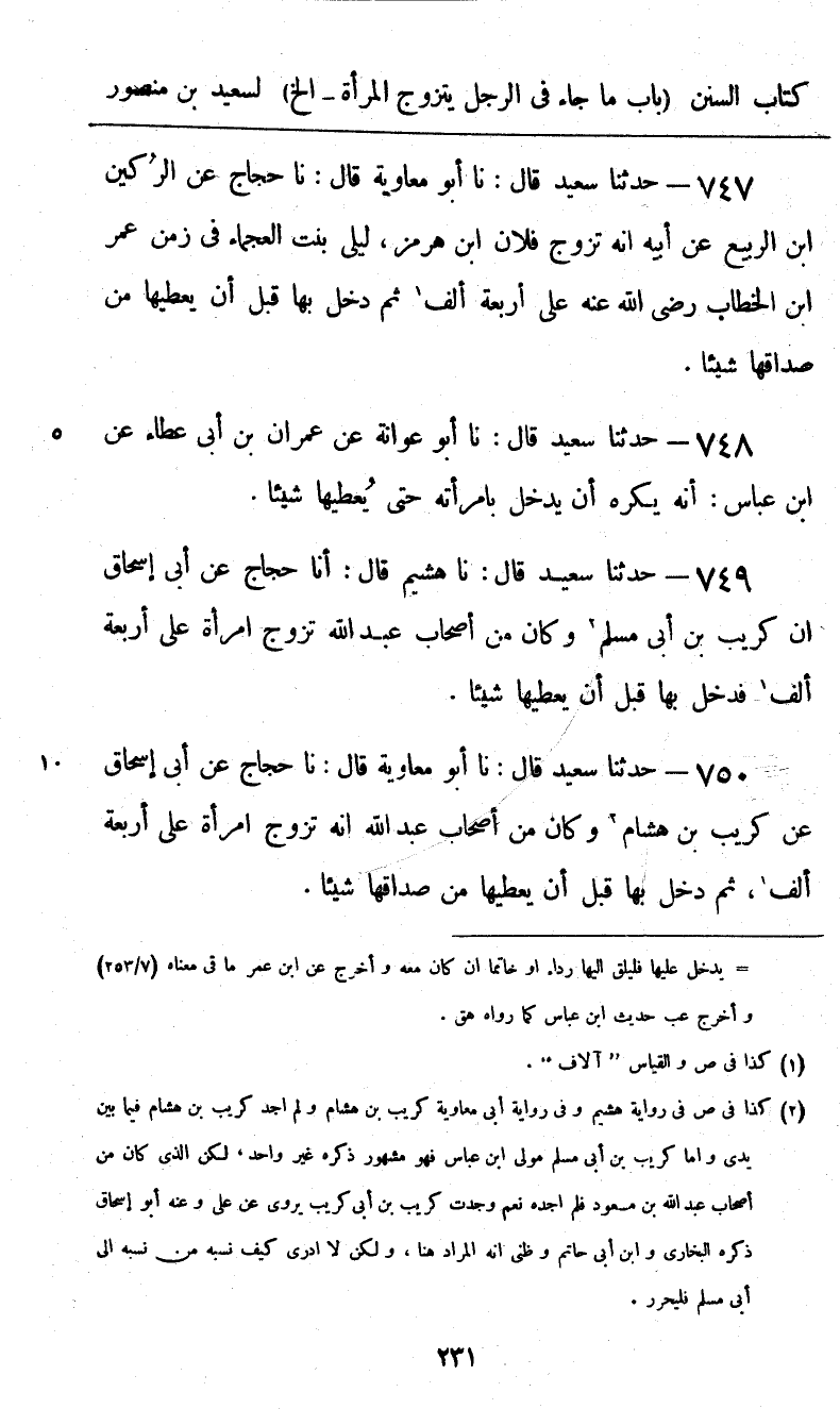 750 - حَدَّثَنَا سَعِيدٌ قَالَ: نا أَبُو مُعَاوِيَةَ، قَالَ: نا حَجَّاجٌ، عَنْ أَبِي إِسْحَاقَ، عَنْ كُرَيْبِ بْنِ هِشَامٍ، وَكَانَ مِنْ أَصْحَابِ عَبْدِ اللَّهِ، «أَنَّهُ §تَزَوَّجَ امْرَأَةً عَلَى أَرْبَعَةِ آلَافٍ، ثُمَّ دَخَلَ بِهَا قَبْلَ أَنْ يُعْطِيَهَا مِنْ صَدَاقِهَا شَيْئًا»