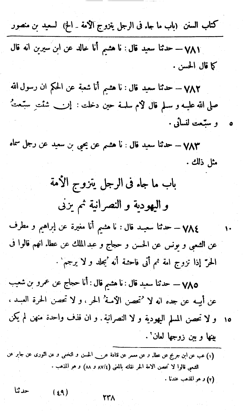 784 - حَدَّثَنَا سَعِيدٌ قَالَ: نا هُشَيْمٌ، أنا مُغِيرَةُ، عَنْ إِبْرَاهِيمَ، وَمُطَرِّفٌ، عَنِ الشَّعْبِيِّ، وَيُونُسُ، عَنِ الْحَسَنِ، وَحَجَّاجٌ، وَعَبْدُ الْمَلِكِ، عَنْ عَطَاءِ بْنِ أَبِيْ رَبَاْح «أَنَّهُمْ قَالُوا فِي الْحُرِّ إِذَا تَزَوَّجَ أَمَةً ثُمَّ أَتَى فَاحِشَةً §أَنَّهُ يُجْلَدُ وَلَا يُرْجَمُ»