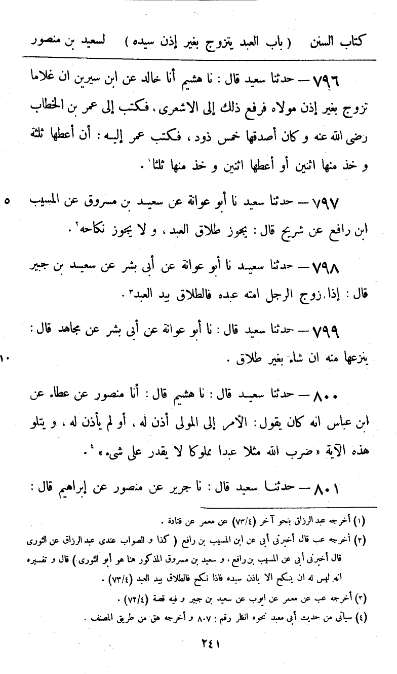 800 - حَدَّثَنَا سَعِيدٌ قَالَ: نا هُشَيْمٌ، قَالَ: أنا مَنْصُورٌ، عَنْ عَطَاءٍ، عَنِ ابْنِ عَبَّاسٍ، أَنَّهُ كَانَ يَقُولُ: «§الْأَمْرُ إِلَى الْمَوْلَى أَذِنَ لَهُ، أَوْ لَمْ يَأْذَنْ لَهُ» ، وَيَتْلُو هَذِهِ الْآيَةَ {ضَرَبَ اللَّهُ مَثَلًا عَبْدًا مَمْلُوكًا لَا يَقْدِرُ عَلَى شَيْءٍ} [النحل: 75]