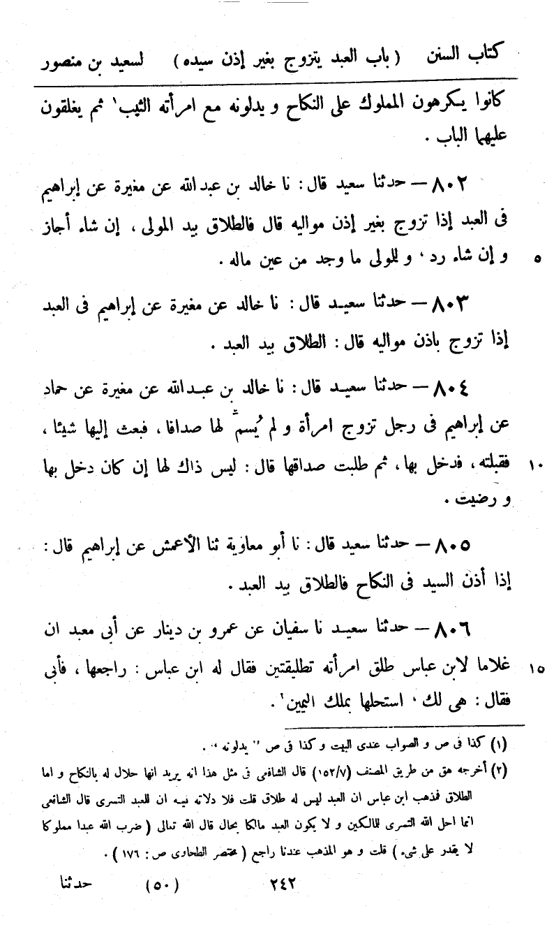 803 - حَدَّثَنَا سَعِيدٌ قَالَ: نا خَالِدٌ، عَنْ مُغِيرَةَ، عَنْ إِبْرَاهِيمَ فِي الْعَبْدِ إِذَا تَزَوَّجَ بِإِذْنِ مَوَالِيهِ قَالَ: «§الطَّلَاقُ بِيَدِ الْعَبْدِ»