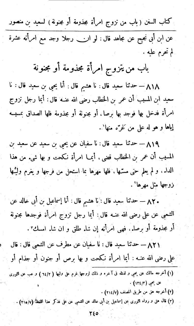 820 - حَدَّثَنَا سَعِيدٌ قَالَ: نا هُشَيْمٌ، قَالَ: أنا إِسْمَاعِيلُ بْنُ أَبِي خَالِدٍ، عَنِ الشَّعْبِيِّ، عَنْ عَلِيٍّ، رَضِيَ اللَّهُ عَنْهُ قَالَ: «§أَيُّمَا رَجُلٍ تَزَوَّجَ امْرَأَةً، فَوَجَدَهَا مَجْنُونَةً أَوْ مَجْذُومَةً أَوْ بَرْصَاءَ، فَهِيَ امْرَأَتُهُ، إِنْ شَاءَ طَلَّقَ، وَإِنْ شَاءَ أَمْسَكَ»