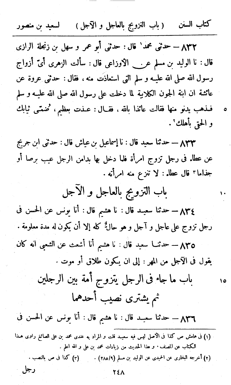 835 - حَدَّثَنَا سَعِيدٌ قَالَ: نا هُشَيْمٌ، أنا أَشْعَثُ، عَنِ الشَّعْبِيِّ، أَنَّهُ كَانَ يَقُولُ فِي الْآجِلِ مِنَ الْمَهْرِ: «§إِلَى أَنْ يَكُونَ طَلَاقٌ أَوْ مَوْتٌ»