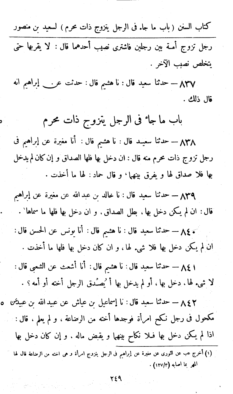 838 - حَدَّثَنَا سَعِيدٌ قَالَ: نا هُشَيْمٌ، قَالَ: أنا مُغِيرَةُ، عَنْ إِبْرَاهِيمَ فِي رَجُلٍ تَزَوَّجَ ذَاتَ مَحْرَمٍ مِنْهُ قَالَ: «§إِنْ دَخَلَ بِهَا فَلَهَا الصَّدَاقُ، وَإِنْ كَانَ لَمْ يَدْخُلْ بِهَا فَلَا صَدَاقَ لَهَا، وَيُفَرَّقُ بَيْنَهُمَا»