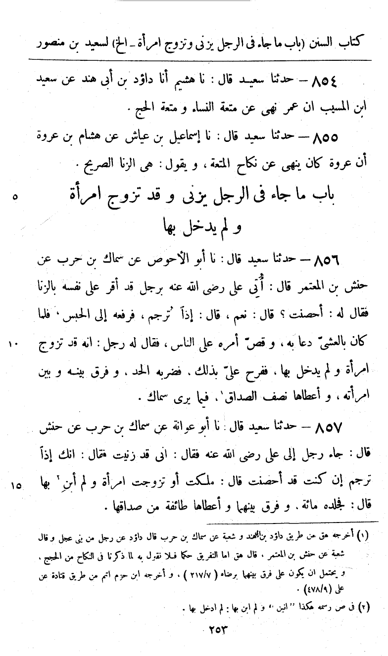 856 - حَدَّثَنَا سَعِيدٌ قَالَ: نا أَبُو الْأَحْوَصِ، عَنْ سِمَاكِ بْنِ حَرْبٍ، عَنْ حَنَشِ بْنِ الْمُعْتَمِرِ، قَالَ: أُتِيَ عَلِيٌّ رَضِيَ اللَّهُ عَنْهُ بِرَجُلٍ قَدْ أَقَرَّ عَلَى نَفْسِهِ بِالزِّنَا، فَقَالَ لَهُ: أَحْصَنْتَ؟ قَالَ: نَعَمْ. قَالَ: §إِذًا تُرْجَمَ. فَرَفَعَهُ إِلَى الْحَبْسِ، فَلَمَّا كَانَ بِالْعَشِيِّ دَعَا بِهِ، وَقَصَّ أَمْرَهُ عَلَى النَّاسِ، فَقَالَ لَهُ رَجُلٌ:: إِنَّهُ قَدْ تَزَوَّجَ امْرَأَةً وَلَمْ يَدْخُلْ بِهَا. فَفَرِحَ عَلِيٌّ بِذَلِكَ، فَضَرَبَهُ الْحَدَّ، وَفَرَّقَ بَيْنَهُ وَبَيْنَ امْرَأَتِهِ، وَأَعْطَاهَا نِصْفَ الصَّدَاقِ، فِيمَا يَرَى سِمَاكٌ