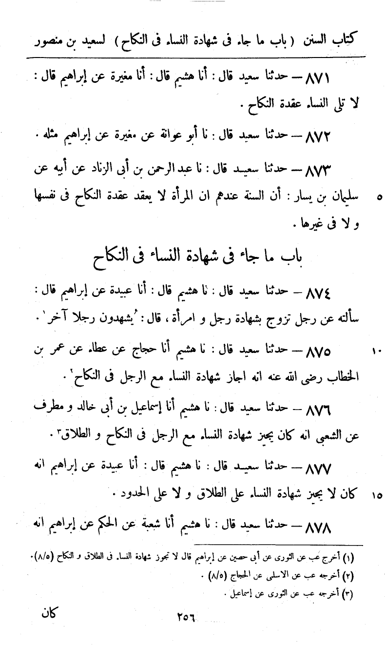 877 - حَدَّثَنَا سَعِيدٌ قَالَ: نا هُشَيْمٌ، قَالَ: أنا عُبَيْدَةُ، عَنْ إِبْرَاهِيمَ «أَنَّهُ §كَانَ لَا يُجِيزُ شَهَادَةَ النِّسَاءِ عَلَى الطَّلَاقِ وَلَا عَلَى الْحُدُودِ»