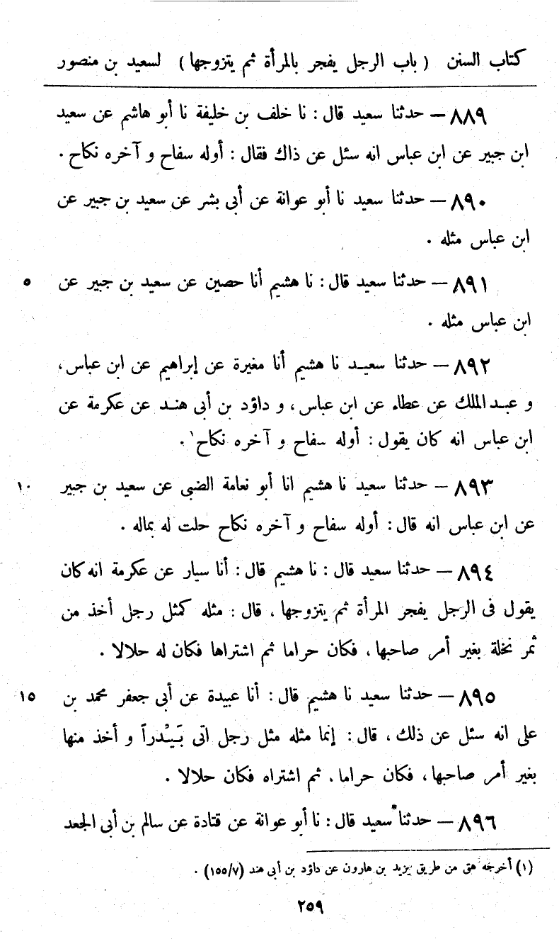 892 - حَدَّثَنَا سَعِيدٌ، نا هُشَيْمٌ، أنا مُغِيرَةُ، عَنْ إِبْرَاهِيمَ، عَنِ ابْنِ عَبَّاسٍ، وَعَبْدُ الْمَلِكِ، عَنْ عَطَاءٍ، عَنِ ابْنِ عَبَّاسٍ، وَدَاوُدُ بْنُ أَبِي هِنْدَ، عَنْ عِكْرِمَةَ، عَنِ ابْنِ عَبَّاسٍ، أَنَّهُ كَانَ يَقُولُ: «§أَوَّلُهُ سِفَاحٌ، وَآخِرُهُ نِكَاحٌ»
