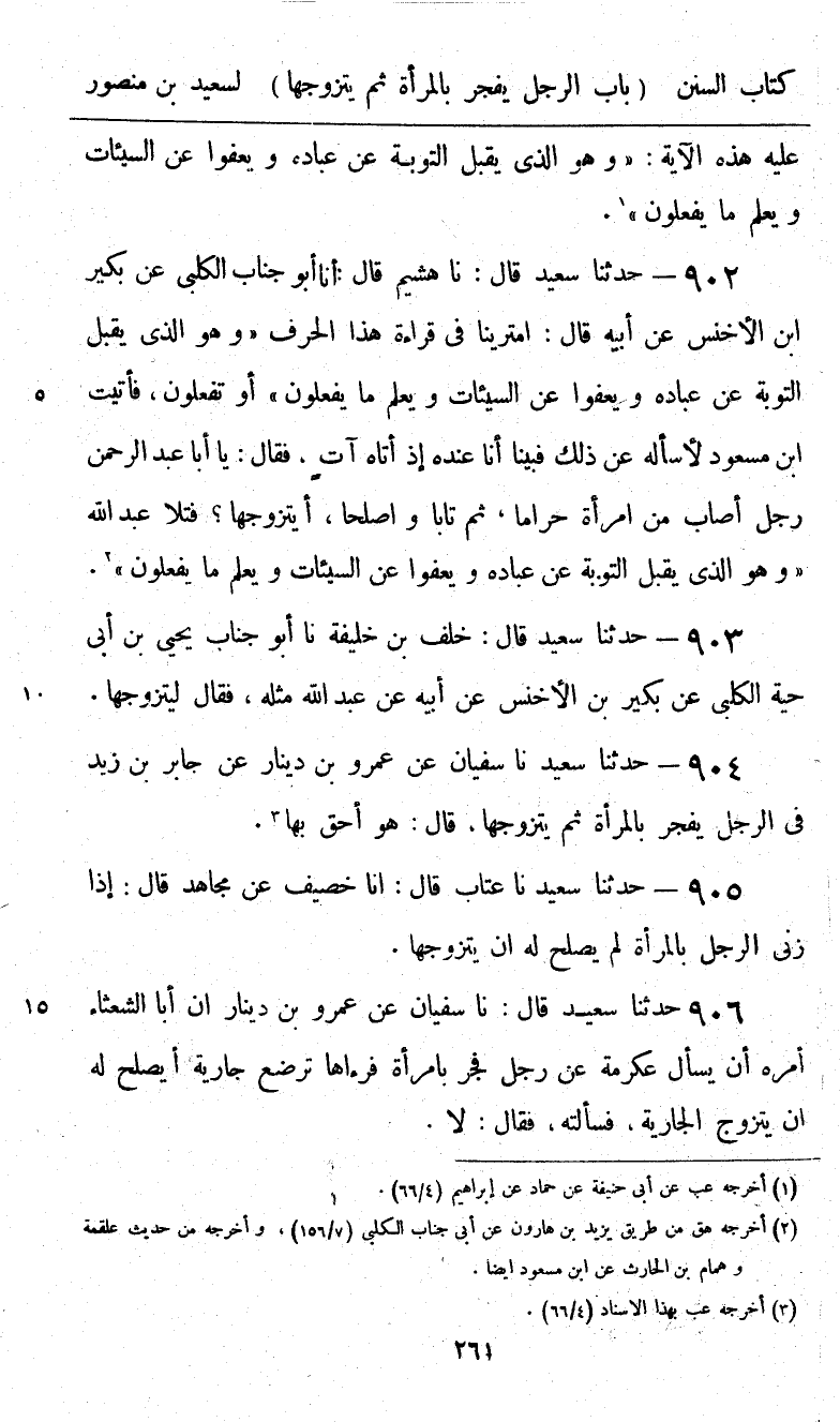 902 - حَدَّثَنَا سَعِيدٌ قَالَ: نا هُشَيْمٌ، قَالَ: أنا أَبُو جَنَابٍ الْكَلْبِيُّ، عَنْ بُكَيْرِ بْنِ الْأَخْنَسِ، عَنْ أَبِيهِ قَالَ: امْتَرَيْنَا فِي قِرَاءَةِ هَذَا الْحَرْفِ: {§وَهُوَ الَّذِي يَقْبَلُ التَّوْبَةَ عَنْ عِبَادِهِ وَيَعْفُو عَنِ السَّيِّئَاتِ وَيَعْلَمُ مَا تَفْعَلُونَ} [الشورى: 25] أَوْ (يَفْعَلُونَ) ، فَأَتَيْتُ ابْنَ مَسْعُودٍ لِأَسْأَلَهُ عَنْ ذَلِكَ، فَبَيْنَا أَنَا عِنْدَهُ إِذْ أَتَاهُ آتٍ، فَقَالَ: يَا أَبَا عَبْدِ الرَّحْمَنِ، رَجُلٌ أَصَابَ مِنَ امْرَأَةٍ حَرَامًا، ثُمَّ تَابَا وَأَصْلَحَا، أَيَتَزَوَّجُهَا؟ فَتَلَا عَبْدُ اللَّهِ: (وَهُوَ الَّذِي يَقْبَلُ التَّوْبَةَ عَنْ عِبَادِهِ وَيَعْفُو عَنِ السَّيِّئَاتِ وَيَعْلَمُ مَا يَفْعَلُونَ) .