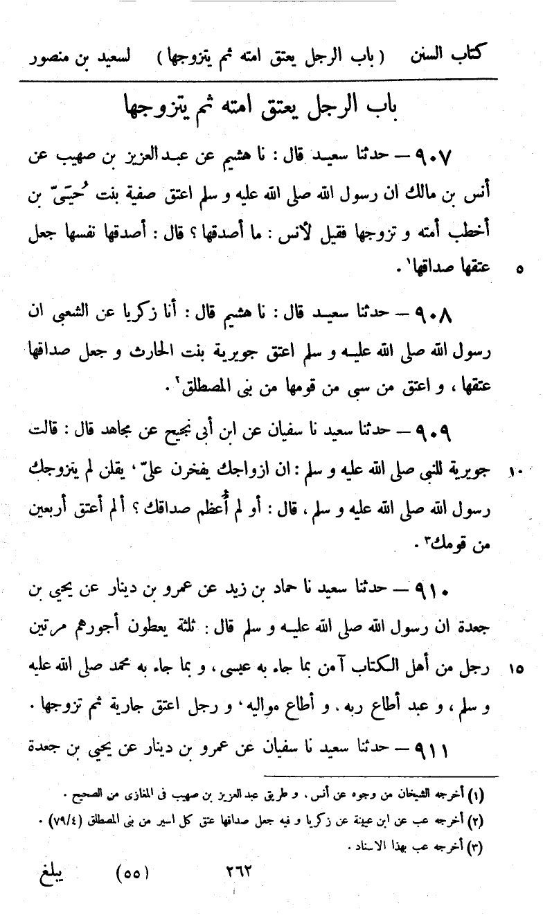 907 - حَدَّثَنَا سَعِيدٌ قَالَ: نا هُشَيْمٌ، عَنْ عَبْدِ الْعَزِيزِ بْنِ صُهَيْبٍ، عَنْ أَنَسِ بْنِ مَالِكٍ " أَنَّ رَسُولَ اللَّهِ صَلَّى اللهُ عَلَيْهِ وَسَلَّمَ §أَعْتَقَ صَفِيَّةَ بِنْتَ حُيَيِّ بْنِ أَخْطَبَ أَمَتَهُ وَتَزَوَّجَهَا، فَقِيلَ لِأَنَسٍ: مَا أَصْدَقَهَا؟ قَالَ: أَصْدَقَهَا نَفْسَهَا، جَعَلَ عِتْقَهَا صَدَاقَهَا "
