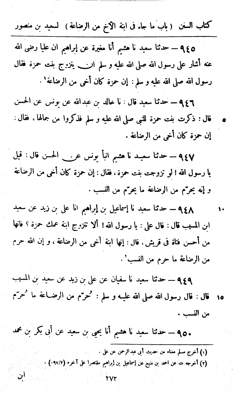 945 - حَدَّثَنَا سَعِيدٌ، نا هُشَيْمٌ، أنا مُغِيرَةُ، عَنْ إِبْرَاهِيمَ، أَنَّ عَلِيًّا، رَضِيَ اللَّهُ عَنْهُ أَشَارَ عَلَى رَسُولِ اللَّهِ صَلَّى اللهُ عَلَيْهِ وَسَلَّمَ أَنْ يَتَزَوَّجَ بِنْتَ حَمْزَةَ، فَقَالَ رَسُولُ اللَّهِ صَلَّى اللهُ عَلَيْهِ وَسَلَّمَ: «إِنَّ حَمْزَةَ §كَانَ أَخِي مِنَ الرَّضَاعَةِ»