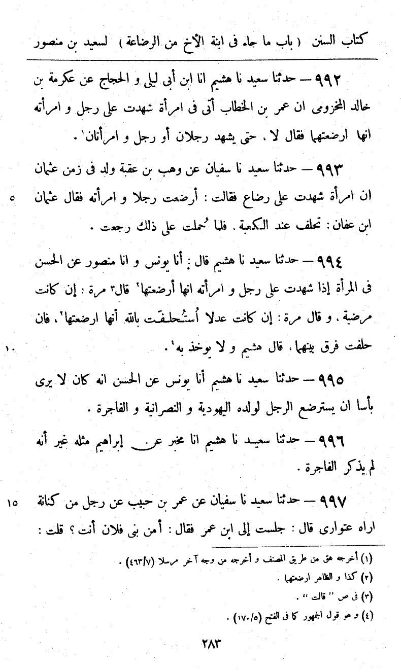 992 - حَدَّثَنَا سَعِيدٌ، نا هُشَيْمٌ، أنا ابْنُ أَبِي لَيْلَى، وَالْحَجَّاجُ، عَنْ عِكْرِمَةَ بْنِ خَالِدٍ الْمَخْزُومِيِّ، أَنَّ عُمَرَ بْنَ الْخَطَّابِ أُتِيَ فِي امْرَأَةٍ شَهِدَتْ عَلَى رَجُلٍ وَامْرَأَتِهِ أَنَّهَا أَرْضَعَتْهُمَا، فَقَالَ: «لَا، §حَتَّى يَشْهَدَ رَجُلَانِ أَوْ رَجُلٌ وَامْرَأَتَانِ»