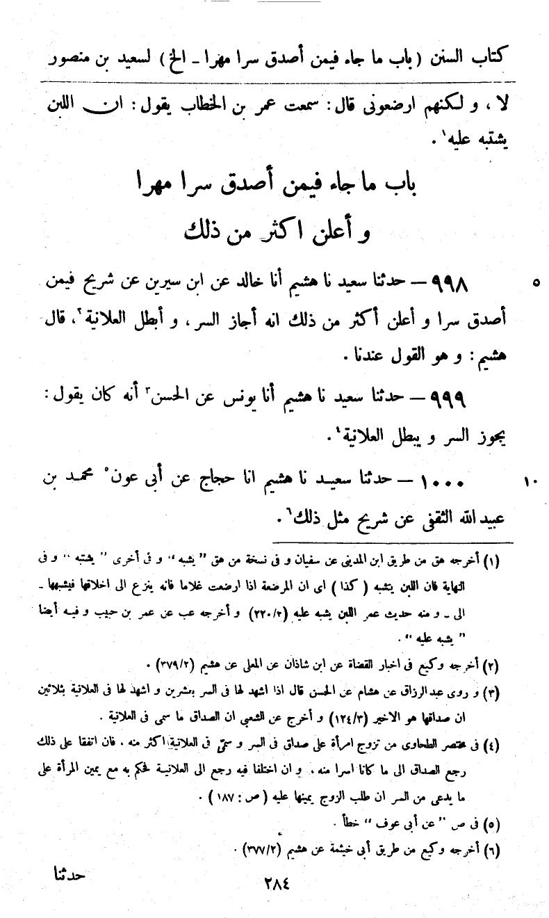 998 - حَدَّثَنَا سَعِيدٌ، نا هُشَيْمٌ، أنا خَالِدٌ، عَنِ ابْنِ سِيرِينَ، عَنْ شُرَيْحٍ «فِيمَنْ أَصْدَقَ سِرًّا وَأَعْلَنَ أَكْثَرَ مِنْ ذَلِكَ §أَنَّهُ أَجَازَ السِّرَّ، وَأَبْطَلَ الْعَلَانِيَةَ» قَالَ هُشَيْمٌ: وَهُوَ الْقَوْلُ عِنْدَنَا