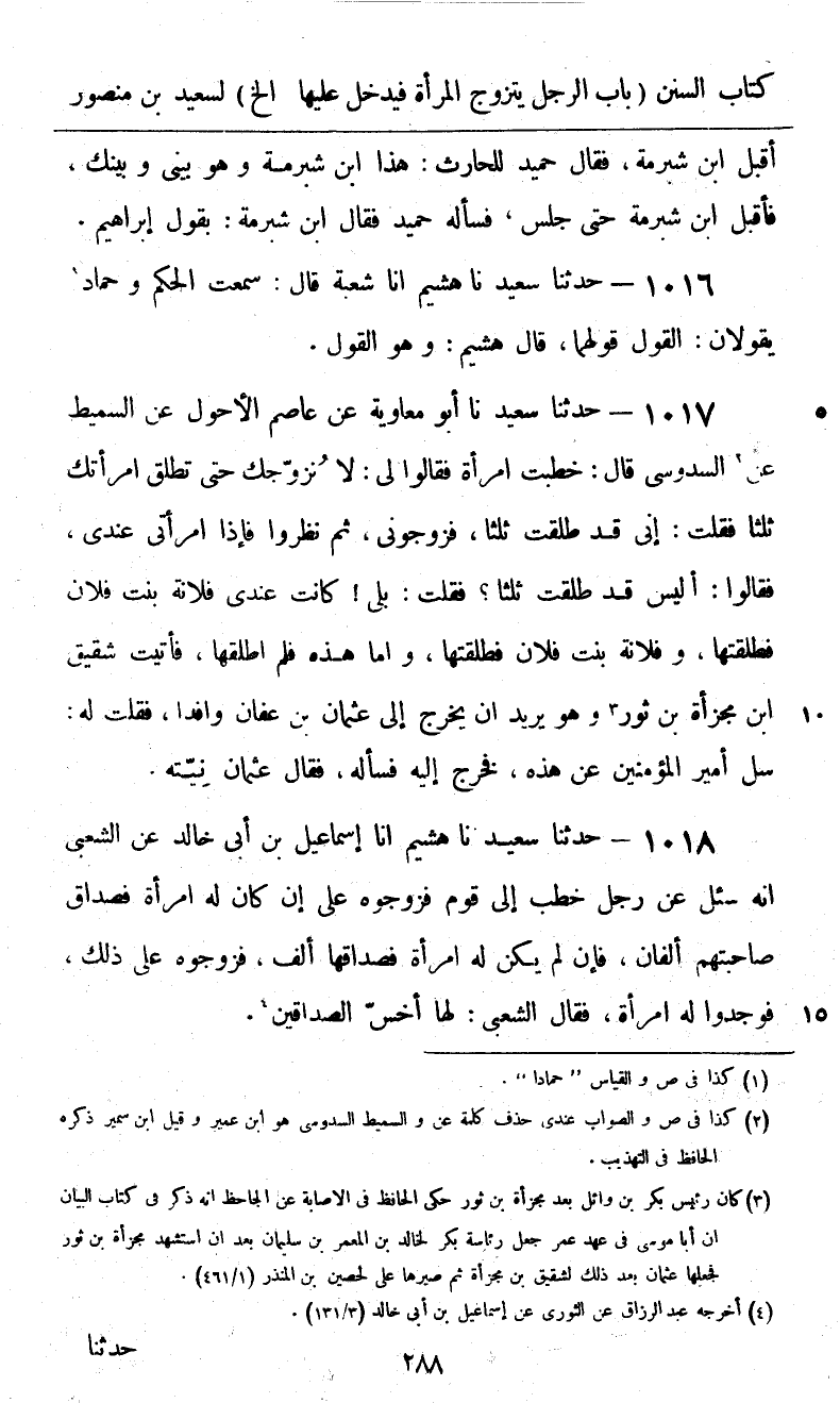 1017 - حَدَّثَنَا سَعِيدٌ، نا أَبُو مُعَاوِيَةَ، عَنْ عَاصِمٍ الْأَحْوَلِ، عَنْ السُّمَيْطِ السَّدُوسِيِّ قَالَ: " خَطَبْتُ امْرَأَةً، فَقَالُوا لِي: لَا نُزَوِّجُكَ حَتَّى تُطَلِّقَ امْرَأَتَكَ ثَلَاثًا. فَقُلْتُ: إِنِّي قَدْ §طَلَّقْتُ ثَلَاثًا، فَزَوَّجُونِي، ثُمَّ نَظَرُوا فَإِذَا امْرَأَتِي عِنْدِي، فَقَالُوا: أَلَيْسَ قَدْ طَلَّقْتَ ثَلَاثًا؟ فَقُلْتُ: بَلَى، كَانَتْ عِنْدِي فُلَانَةُ بِنْتُ فُلَانٍ فَطَلَّقْتُهَا، وَفُلَانَةُ بِنْتُ فُلَانٍ فَطَلَّقْتُهَا، وَأَمَّا هَذِهِ فَلَمْ أُطَلِّقْهَا. فَأَتَيْتُ شَقِيقَ بْنَ مَجْزَأَةَ بْنِ ثَوْرٍ وَهُوَ يُرِيدُ أَنْ يَخْرُجَ إِلَى عُثْمَانَ بْنِ عَفَّانَ وَافِدًا، فَقُلْتُ لَهُ: سَلْ أَمِيرَ الْمُؤْمِنِينَ عَنْ هَذِهِ. فَخَرَجَ إِلَيْهِ فَسَأَلَهُ، فَقَالَ عُثْمَانُ: نِيَّتُهُ "