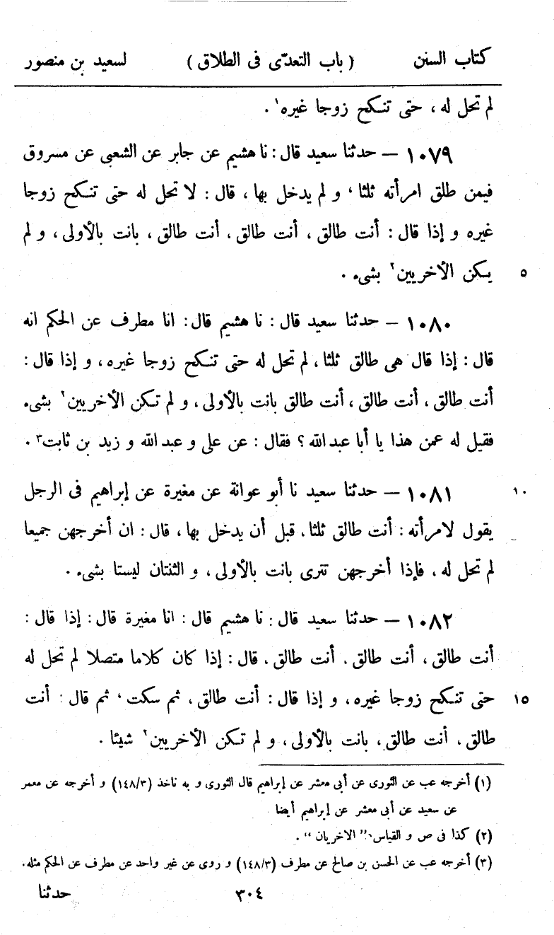 1080 - حَدَّثَنَا سَعِيدٌ قَالَ: نا هُشَيْمٌ، قَالَ: أنا مُطَرِّفٌ، عَنِ الْحَكَمِ أَنَّهُ قَالَ: إِذَا قَالَ: " هِيَ طَالِقٌ ثَلَاثًا، §لَمْ تَحِلَّ لَهُ حَتَّى تَنْكِحَ زَوْجًا غَيْرَهُ، وَإِذَا قَالَ: أَنْتِ طَالِقٌ، أَنْتِ طَالِقٌ، أَنْتِ طَالِقٌ، بَانَتْ بِالْأُولَى، وَلَمْ تَكُنِ الْأُخْرَيَانِ بِشَيْءٍ. فَقِيلَ لَهُ: عَمَّنْ هَذَا يَا أَبَا عَبْدِ اللَّهِ؟ فَقَالَ: عَنْ عَلِيٍّ، وَعَبْدِ اللَّهِ، وَزَيْدِ بْنِ ثَابِتٍ "