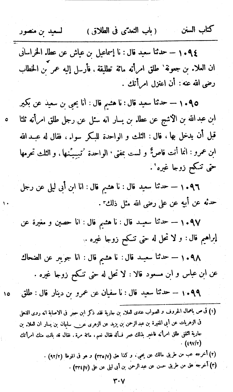 1094 - حَدَّثَنَا سَعِيدٌ قَالَ: نا إِسْمَاعِيلُ بْنُ عَيَّاشٍ، عَنْ عَطَاءٍ الْخُرَاسَانِيِّ، أَنَّ الْعَلَاءَ بْنَ جَعُونَةَ، طَلَّقَ امْرَأَتَهُ مِائَةَ تَطْلِيقَةٍ، فَأَرْسَلَ إِلَيْهِ عُمَرُ بْنُ الْخَطَّابِ رَضِيَ اللَّهُ عَنْهُ: «§أَنِ اعْتَزِلِ امْرَأَتَكَ»
