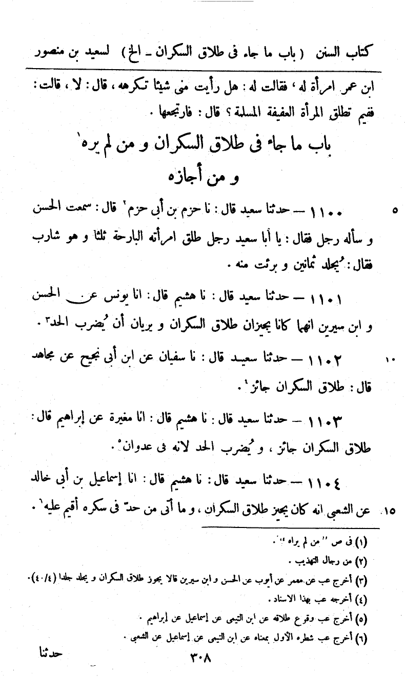 1101 - حَدَّثَنَا سَعِيدٌ قَالَ: نا هُشَيْمٌ، قَالَ: أنا يُونُسُ، عَنِ الْحَسَنِ، وَابْنِ سِيرِينَ «أَنَّهُمَا §كَانَا يُجِيزَانِ طَلَاقَ السَّكْرَانِ وَيَرَيَانِ أَنْ يُضْرَبَ الْحَدَّ»