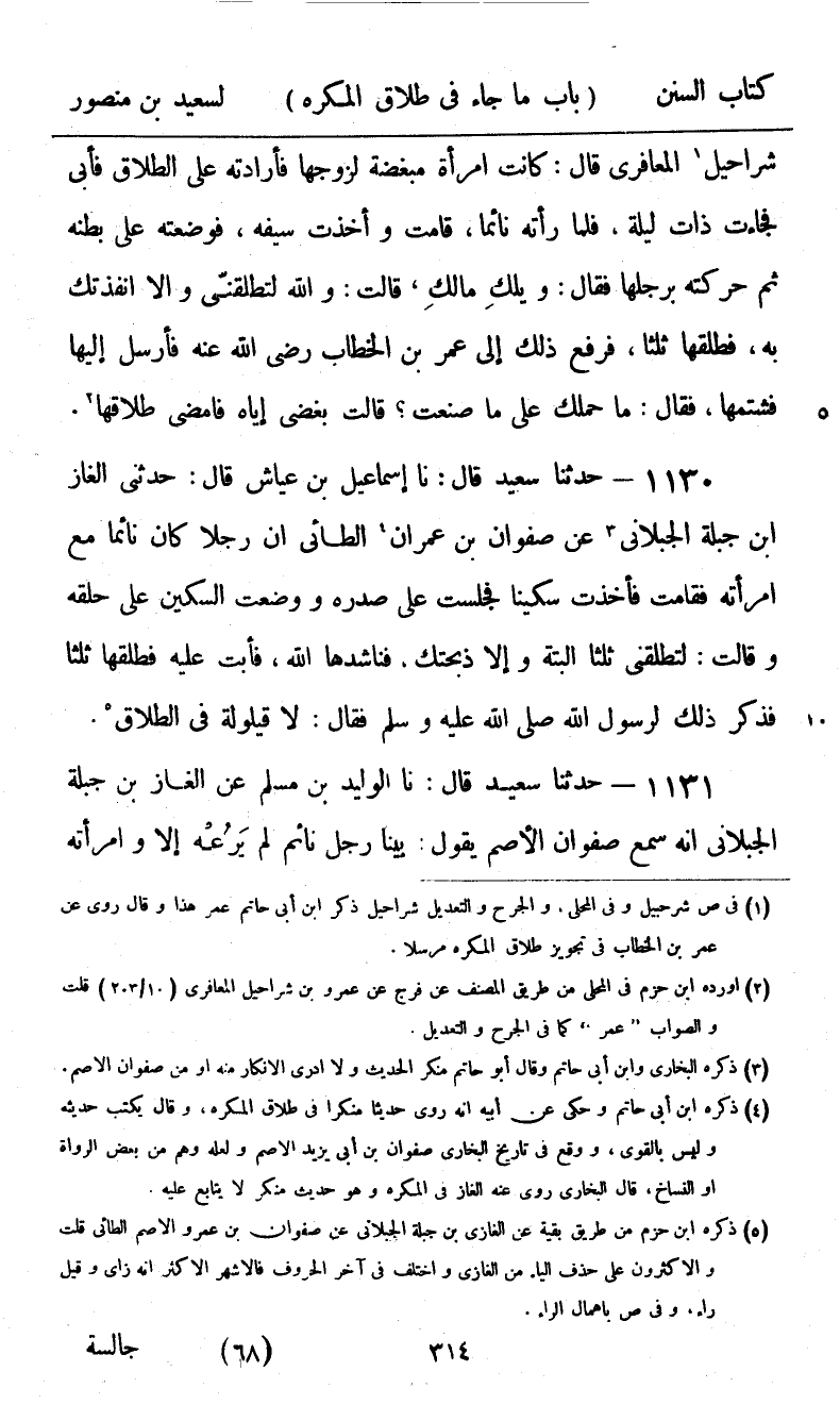 1130 - حَدَّثَنَا سَعِيدٌ قَالَ: نا إِسْمَاعِيلُ بْنُ عَيَّاشٍ قَالَ: حَدَّثَنِي الْغَازُ بْنُ جَبَلَةَ الْجُبْلَانِيُّ، عَنْ صَفْوَانَ بْنِ عِمْرَانَ الطَّائِيِّ، أَنَّ رَجُلًا كَانَ نَائِمًا مَعَ امْرَأَتِهِ فَقَامَتْ فَأَخَذَتْ سِكِّينًا فَجَلَسَتْ عَلَى صَدْرِهِ وَوَضَعَتِ السِّكِّينَ عَلَى حَلْقِهِ وَقَالَتْ: لَتُطَلِّقَنِّي ثَلَاثًا الْبَتَّةَ وَإِلَّا ذَبَحْتُكَ، فَنَاشَدَهَا اللَّهَ، فَأَبَتْ عَلَيْهِ فَطَلَّقَهَا ثَلَاثًا فَذُكِرَ ذَلِكَ لِرَسُولِ اللَّهِ صَلَّى اللهُ عَلَيْهِ وَسَلَّمَ فَقَالَ: «§لَا قَيْلُولَةَ فِي الطَّلَاقِ»