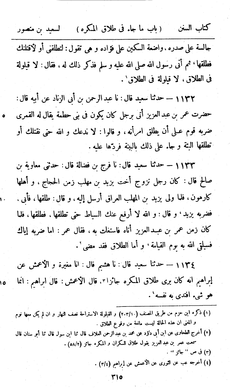 1132 - حَدَّثَنَا سَعِيدٌ قَالَ: نا عَبْدُ الرَّحْمَنِ بْنُ أَبِي الزِّنَادِ، عَنْ أَبِيهِ، قَالَ: حَضَرْتُ عُمَرَ بْنِ عَبْدِ الْعَزِيزِ أُتِيَ بِرَجُلٍ كَانَ يَكُونُ فِي بَنِي حَطْمَةَ يُقَالُ لَهُ: الْقُمَّرِيُّ ضَرَبَهُ قَوْمٌ عَلَى أَنْ يُطَلِّقَ امْرَأَتَهُ، وَقَالُوا: «لَا نَدَعُكَ وَاللَّهِ حَتَّى نَقْتُلَكَ أَوْ تُطَلِّقَهَا الْبَتَّةَ وَجَاءَ عَلَى ذَلِكَ بِالْبَيِّنَةِ §فَرَدَّهَا عَلَيْهِ»