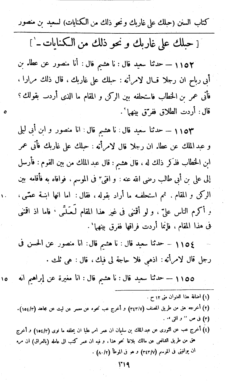 1153 - حَدَّثَنَا سَعِيدٌ قَالَ: نا هُشَيْمٌ، قَالَ: أنا مَنْصُورٌ، وَابْنُ أَبِي لَيْلَى، وَعَبْدُ الْمَلِكِ، عَنْ عَطَاءٍ، أَنَّ رَجُلًا قَالَ لِامْرَأَتِهِ: حَبْلُكِ عَلَى غَارِبِكِ، فَأَتَى عُمَرَ بْنَ الْخَطَّابِ فَذَكَرَ ذَلِكَ لَهُ. قَالَ هُشَيْمٌ: قَالَ عَبْدُ الْمَلِكِ مِنْ بَيْنِ الْقَوْمِ: فَأَرْسَلَ إِلَى عَلِيِّ بْنِ أَبِي طَالِبٍ رَضِيَ اللَّهُ عَنْهُ: وَافِنِي فِي الْمَوْسِمِ، فَوَافَاهُ بِهِ فَأَقَامَهُ بَيْنَ الرُّكْنِ وَالْمَقَامِ ثُمَّ «§اسْتَحْلَفَهُ مَا أَرَادَ بِقَوْلِهِ؟» فَقَالَ: أَمَا إِنَّهَا ابْنَةُ عَمِّي وَأَكْرَمُ النَّاسِ عَلَيَّ، وَلَوْ أَقَمْتَنِي فِي غَيْرِ هَذَا الْمَقَامِ لَعَلِّي , فَأَمَّا إِذْ أَقَمْتَنِي فِي هَذَا الْمَقَامِ، فَإِنَّمَا أَرَدْتُ فِرَاقَهَا، «فَفَرَّقَ بَيْنَهُمَا»