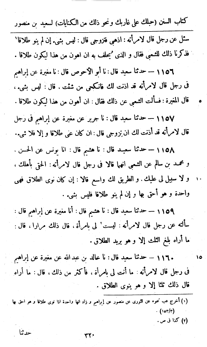 1159 - حَدَّثَنَا سَعِيدٌ قَالَ: نا هُشَيْمٌ، قَالَ: أنا مُغِيرَةُ، عَنْ إِبْرَاهِيمَ، قَالَ: سَأَلْتُهُ عَنْ رَجُلٍ قَالَ لِامْرَأَتِهِ: لَيْسَتْ لِي بِامْرَأَةٍ، قَالَ ذَلِكَ مِرَارًا، قَالَ: «§مَا أَرَاهُ بَلَغَ الثَّلَاثَ إِلَّا وَهُوَ يُرِيدُ الطَّلَاقَ»