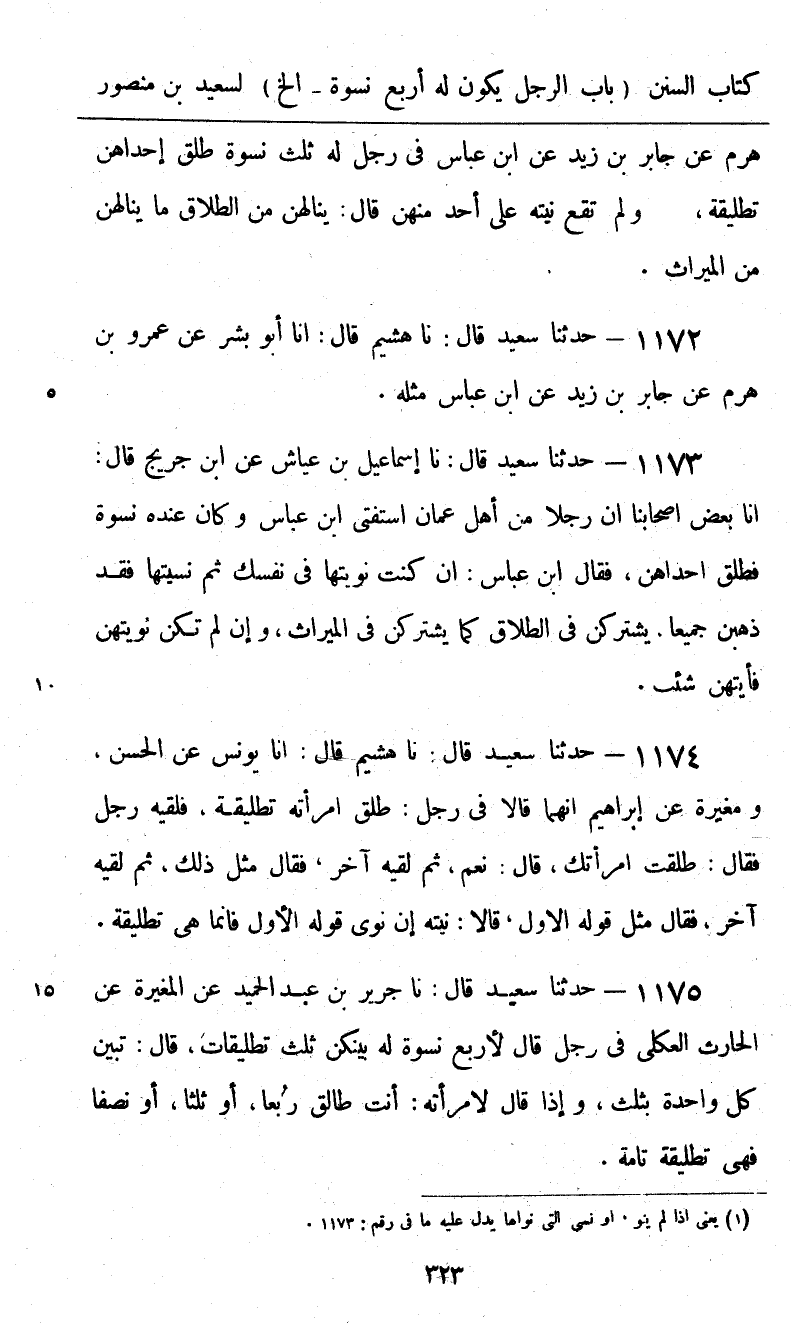 1173 - حَدَّثَنَا سَعِيدٌ قَالَ: نا إِسْمَاعِيلُ بْنُ عَيَّاشٍ، عَنِ ابْنِ جُرَيْجٍ، قَالَ: أنا بَعْضُ أَصْحَابِنَا أَنَّ رَجُلًا مِنْ أَهْلِ عُمَانَ اسْتَفْتَى ابْنَ عَبَّاسٍ وَكَانَ عِنْدَهُ نِسْوَةٌ فَطَلَّقَ إِحْدَاهُنَّ، فَقَالَ ابْنُ عَبَّاسٍ: «§إِنْ كُنْتَ نَوَيْتَهَا فِي نَفْسِكَ ثُمَّ نَسِيتَهَا فَقَدْ ذَهَبْنَ جَمِيعًا، يَشْتَرِكْنَ فِي الطَّلَاقِ كَمَا يَشْتَرِكْنَ فِي الْمِيرَاثِ، وَإِنْ لَمْ تَكُنْ نَوَيْتَهُنَّ فَأَيَّتَهُنَّ شِئْتَ»