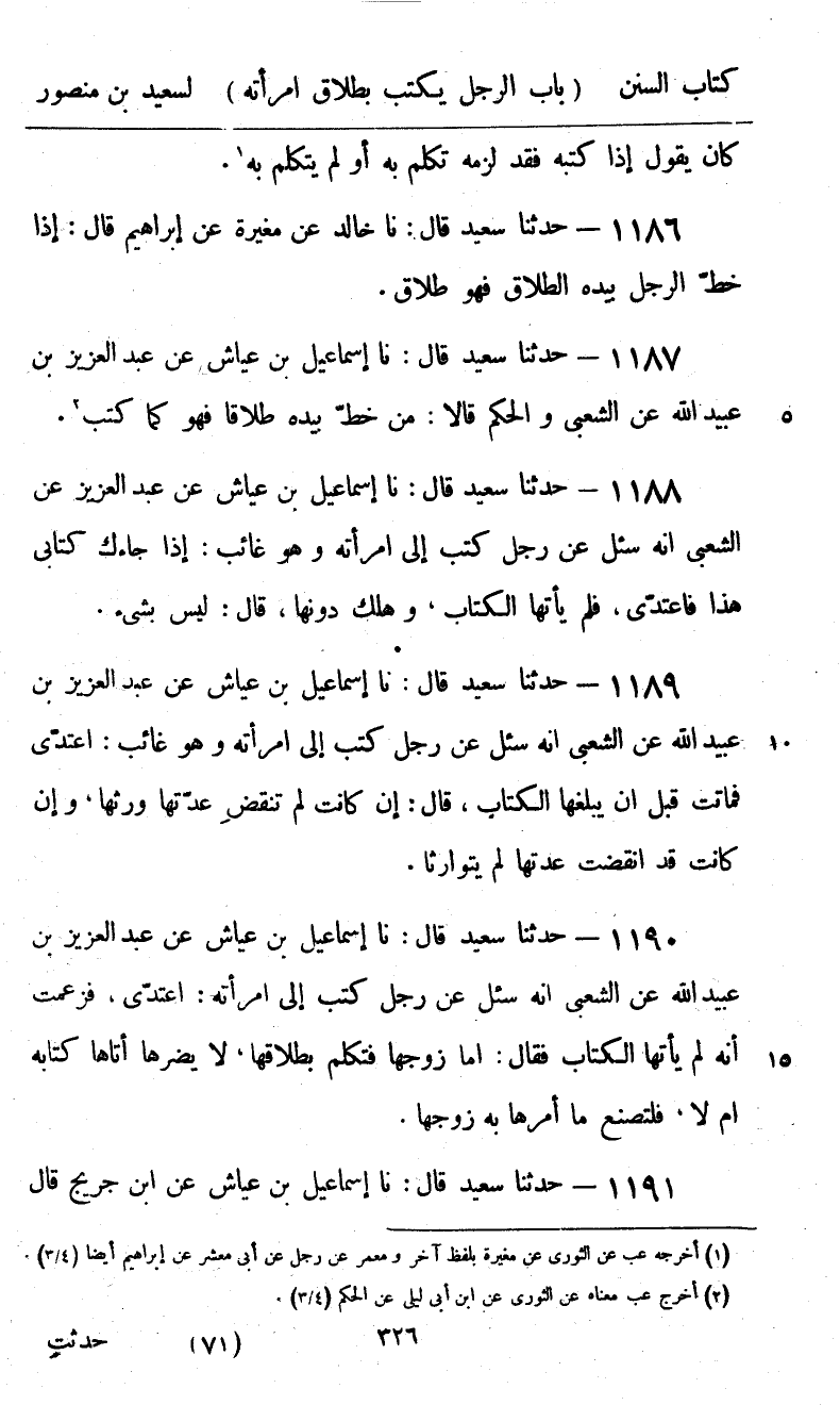 1189 - حَدَّثَنَا سَعِيدٌ قَالَ: نا إِسْمَاعِيلُ بْنُ عَيَّاشٍ، عَنْ عَبْدِ الْعَزِيزِ بْنِ عُبَيْدِ اللَّهِ، عَنِ الشَّعْبِيِّ أَنَّهُ سُئِلَ عَنْ رَجُلٍ كَتَبَ إِلَى امْرَأَتِهِ وَهُوَ غَائِبٌ: اعْتَدِّي، فَمَاتَتْ قَبْلَ أَنْ يَبْلُغَهَا الْكِتَابُ، قَالَ: «§إِنْ كَانَتْ لَمْ تَنْقَضِ عِدَّتُهَا وَرِثَهَا، وَإِنْ كَانَتْ قَدِ انْقَضَتْ عِدَّتُهَا لَمْ يَتَوَارَثَا»
