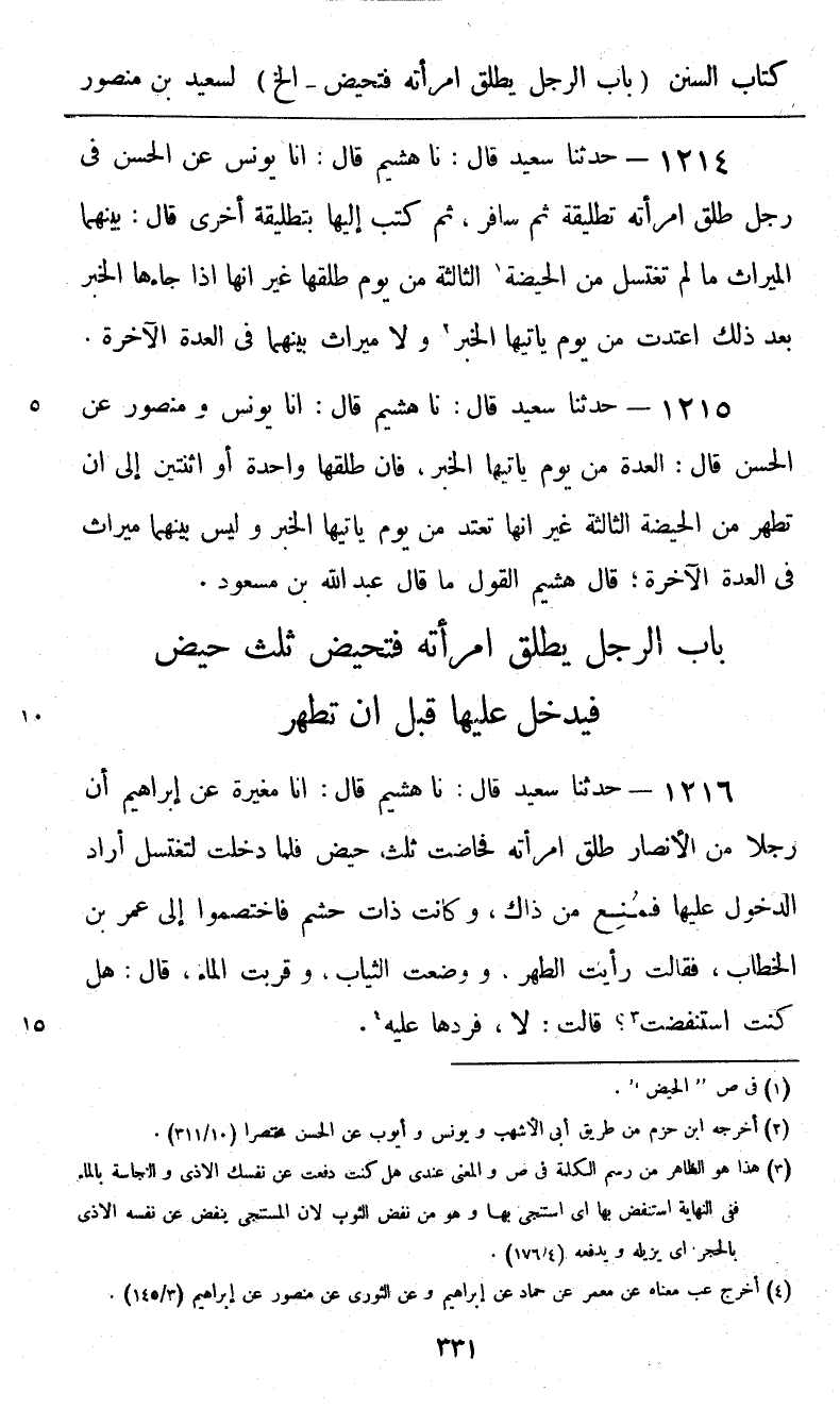 1214 - حَدَّثَنَا سَعِيدٌ قَالَ: نا هُشَيْمٌ، قَالَ: أنا يُونُسُ، عَنِ الْحَسَنِ فِي رَجُلٍ طَلَّقَ امْرَأَتَهُ تَطْلِيقَةً، ثُمَّ سَافَرَ، ثُمَّ كَتَبَ إِلَيْهَا بِتَطْلِيقَةٍ أُخْرَى، قَالَ: «§بَيْنَهُمَا الْمِيرَاثُ مَا لَمْ تَغْتَسِلْ مِنَ الْحَيْضَةِ الثَّالِثَةِ مِنْ يَوْمِ طَلَّقَهَا، غَيْرَ أَنَّهَا إِذَا جَاءَهَا الْخَبَرُ بَعْدَ ذَلِكَ اعْتَدَّتْ مِنْ يَوْمِ يَأتِيَهَا الْخَبَرُ، وَلَا مِيرَاثَ بَيْنَهُمَا فِي الْعِدَّةِ الْآخِرَةِ»