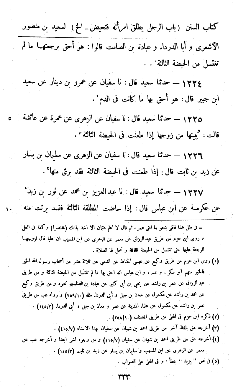 1226 - حَدَّثَنَا سَعِيدٌ قَالَ: نا سُفْيَانُ، عَنِ الزُّهْرِيِّ، عَنْ سُلَيْمَانَ بْنِ يَسَارٍ، عَنْ زَيْدِ بْنِ ثَابِتٍ، قَالَ: «§إِذَا طَعَنَتْ فِي الْحَيْضَةِ الثَّالِثَةِ فَقَدْ بَرِئَ مِنْهَا»