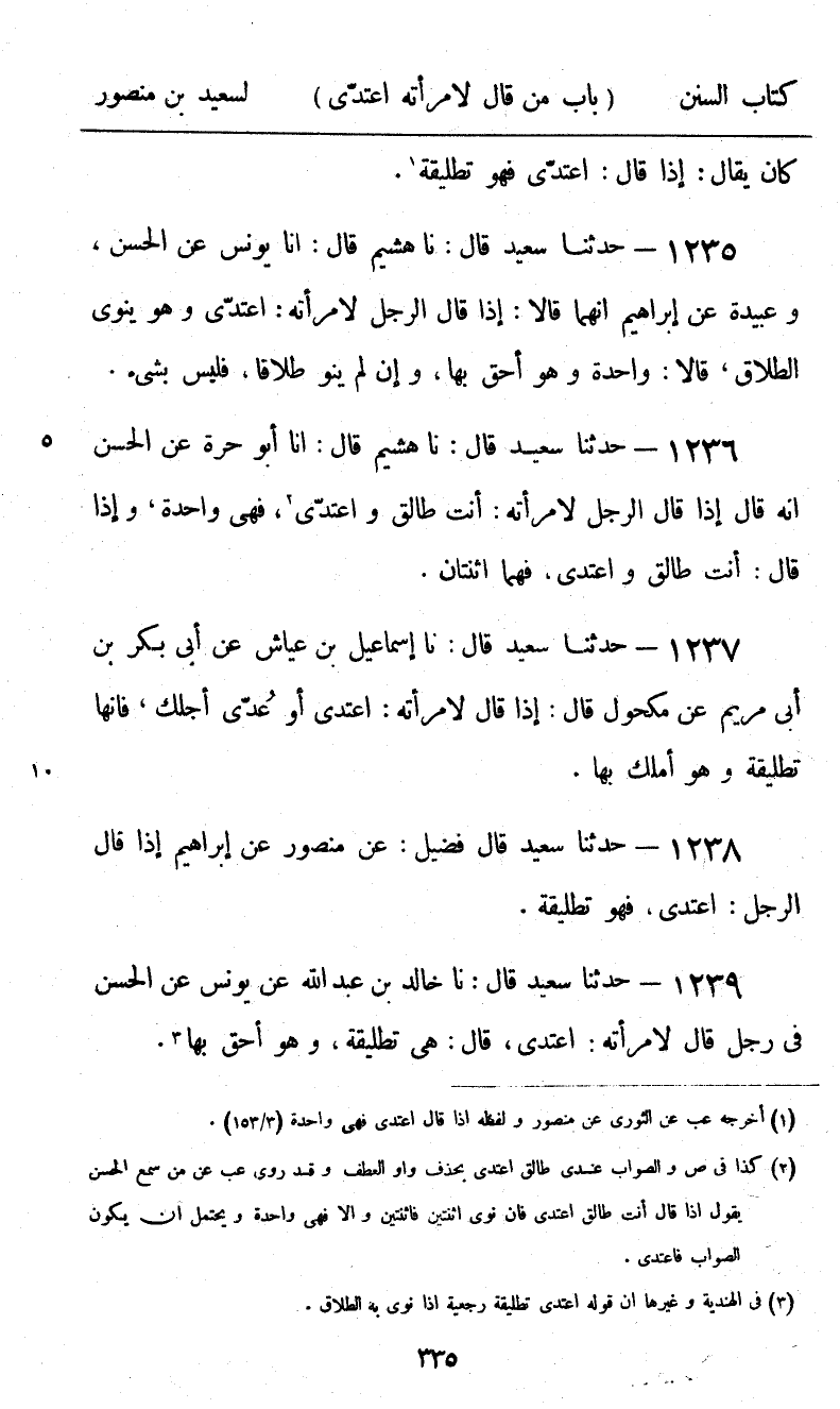 1236 - حَدَّثَنَا سَعِيدٌ قَالَ: نا هُشَيْمٌ، قَالَ: أنا أَبُو حُرَّةَ، عَنِ الْحَسَنِ، أَنَّهُ قَالَ: " إِذَا قَالَ الرَّجُلُ لِامْرَأَتِهِ: §أَنْتِ طَالِقٌ اعْتَدِّي، فَهِيَ وَاحِدَةٌ، وَإِذَا قَالَ: أَنْتِ طَالِقٌ وَاعْتَدِّي، فَهُمَا اثْنَتَانِ "