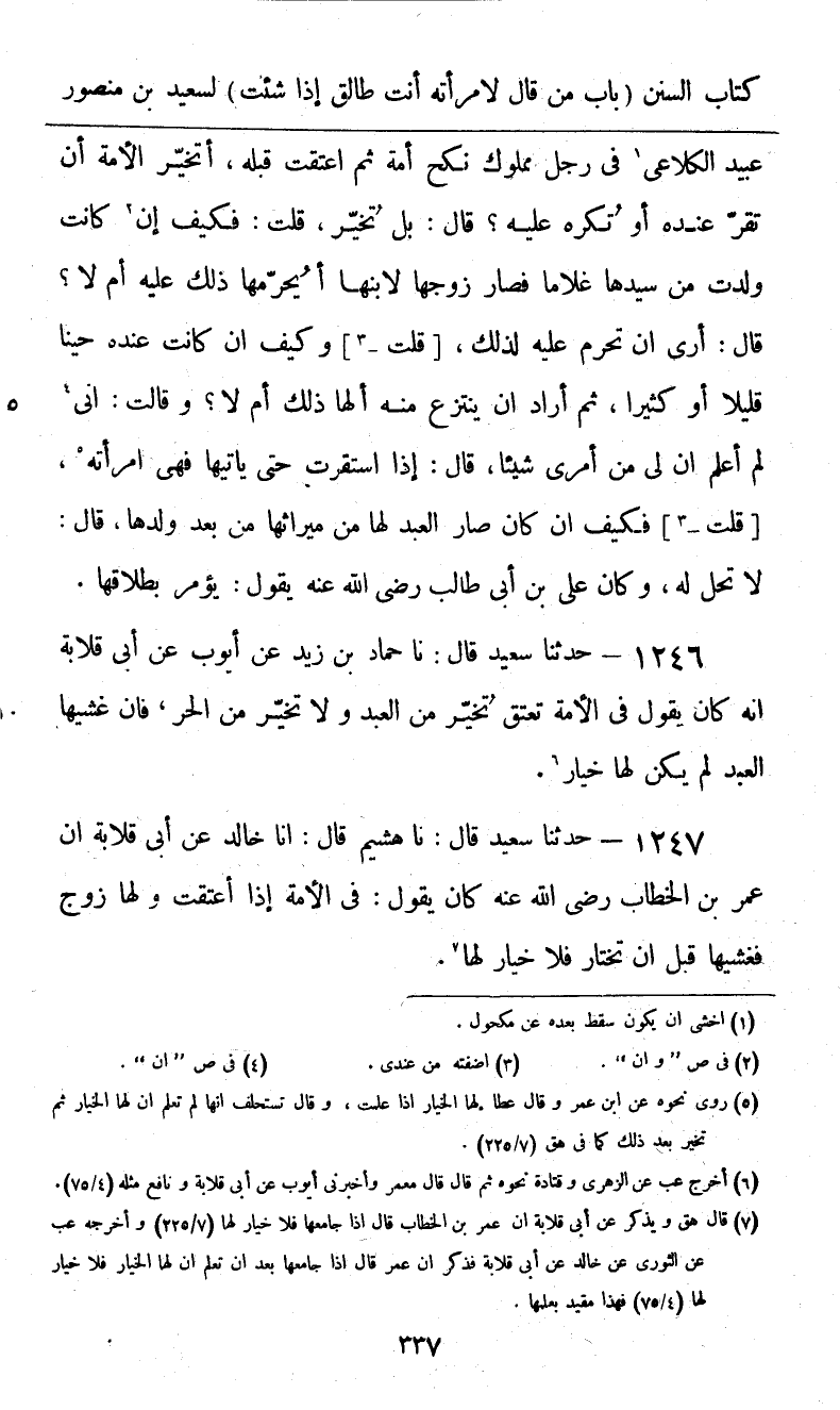 1247 - حَدَّثَنَا سَعِيدٌ قَالَ: نا هُشَيْمٌ، قَالَ: أنا خَالِدٌ، عَنْ أَبِي قِلَابَةَ، أَنَّ عُمَرَ بْنَ الْخَطَّابِ، رَضِيَ اللَّهُ عَنْهُ كَانَ يَقُولُ: «§فِي الْأَمَةِ إِذَا أُعْتِقَتْ وَلَهَا زَوْجٌ فَغَشِيَهَا قَبْلَ أَنْ تَخْتَارَ فَلَا خِيَارَ لَهَا»