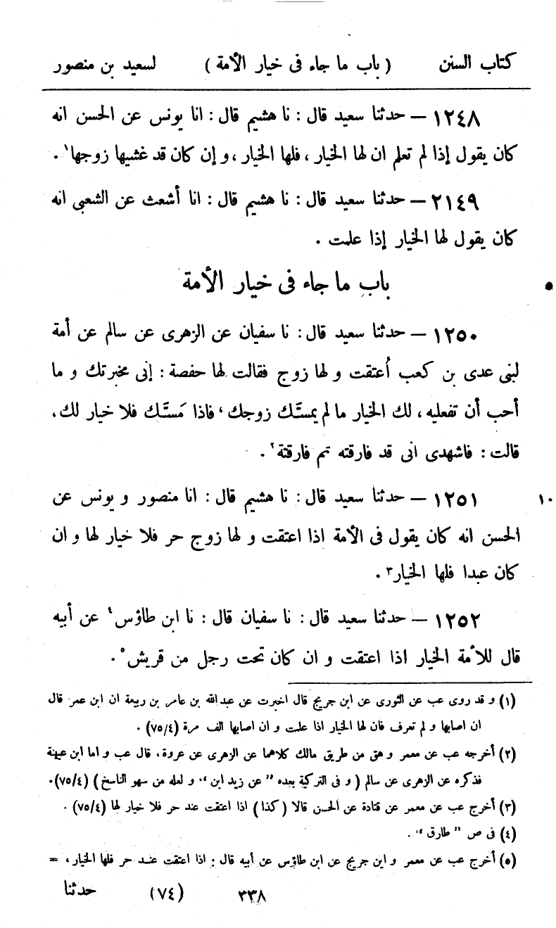 1251 - حَدَّثَنَا سَعِيدٌ قَالَ: نا هُشَيْمٌ، قَالَ: أنا مَنْصُورٌ، وَيُونُسُ، عَنِ الْحَسَنِ «أَنَّهُ كَانَ يَقُولُ فِي الْأَمَةِ §إِذَا أُعْتِقَتْ وَلَهَا زَوْجٌ حُرٌّ فَلَا خِيَارَ لَهَا، وَإِنْ كَانَ عَبْدًا فَلَهَا الْخِيَارُ»