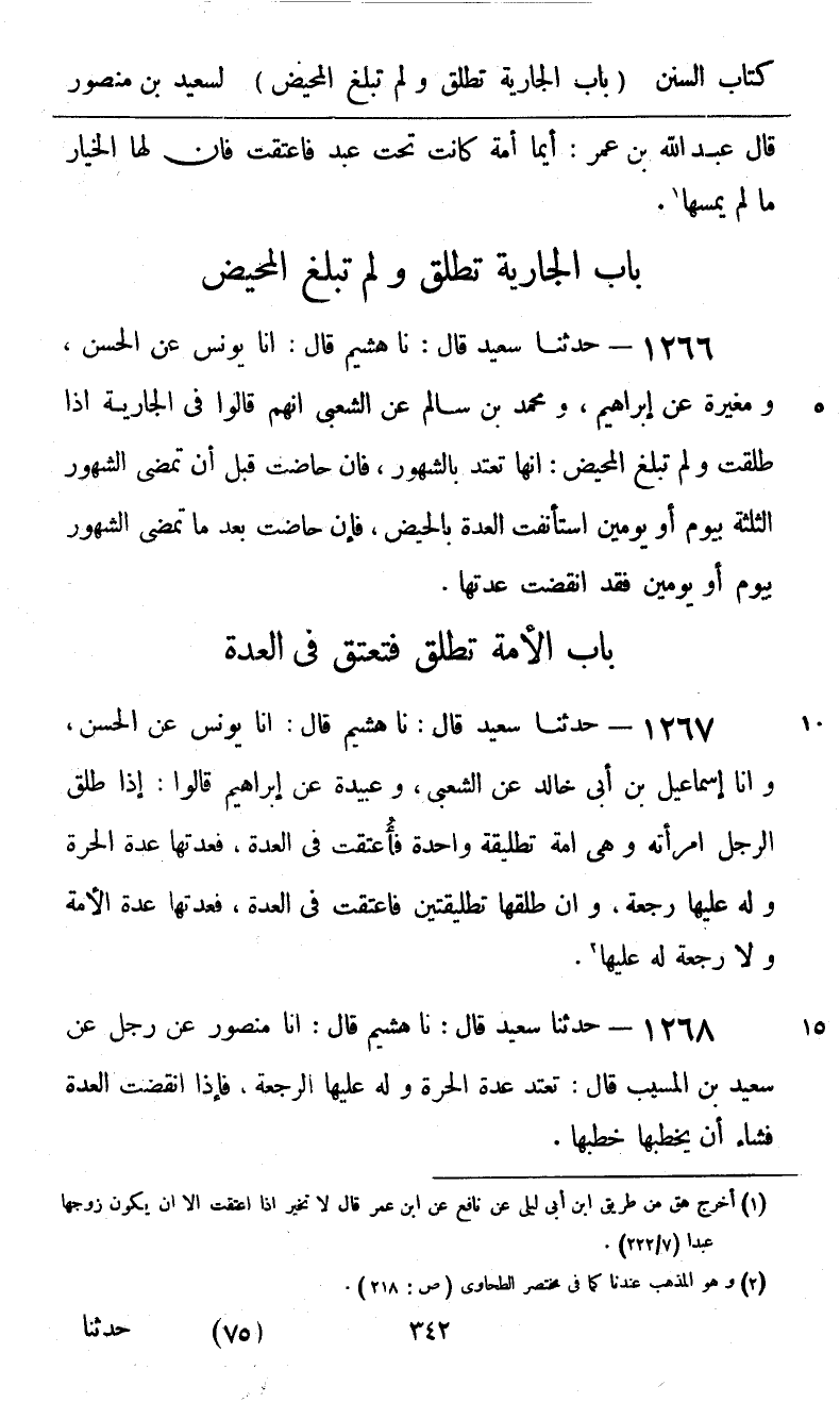 1267 - حَدَّثَنَا سَعِيدٌ قَالَ: نا هُشَيْمٌ، قَالَ: أنا يُونُسُ، عَنِ الْحَسَنِ، وَأنا إِسْمَاعِيلُ بْنُ أَبِي خَالِدٍ، عَنِ الشَّعْبِيِّ، وَعُبَيْدَةُ، عَنْ إِبْرَاهِيمَ، قَالُوا: «§إِذَا طَلَّقَ الرَّجُلُ امْرَأَتَهُ وَهِيَ أَمَةٌ تَطْلِيقَةً وَاحِدَةً فَأُعْتِقَتْ فِي الْعِدَّةِ، فَعِدَّتُهَا عِدَّةُ الْحُرَّةِ وَلَهُ عَلَيْهَا رَجْعَةٌ، وَإِنْ طَلَّقَهَا تَطْلِيقَتَيْنِ فَأُعْتِقَتْ فِي الْعِدَّةِ، فَعِدَّتُهَا عِدَّةَ الْأَمَةِ وَلَا رَجْعَةَ لَهُ عَلَيْهَا»