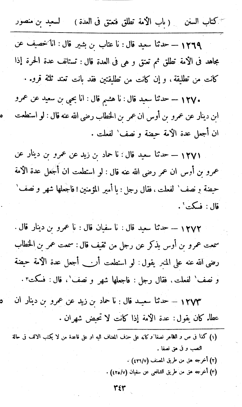 1270 - حَدَّثَنَا سَعِيدٌ قَالَ: نا هُشَيْمٌ، قَالَ: أنا يَحْيَى بْنُ سَعِيدٍ، عَنْ عَمْرِو بْنِ دِينَارٍ، عَنْ عَمْرِو بْنِ أَوْسٍ، أَنَّ عُمَرَ بْنَ الْخَطَّابِ، رَضِيَ اللَّهُ عَنْهُ قَالَ: «§لَوِ اسْتَطَعْتُ أَنْ أَجْعَلَ عِدَّةَ الْأَمَةِ حَيْضَةً وَنِصْفَ لَفَعَلْتُ»