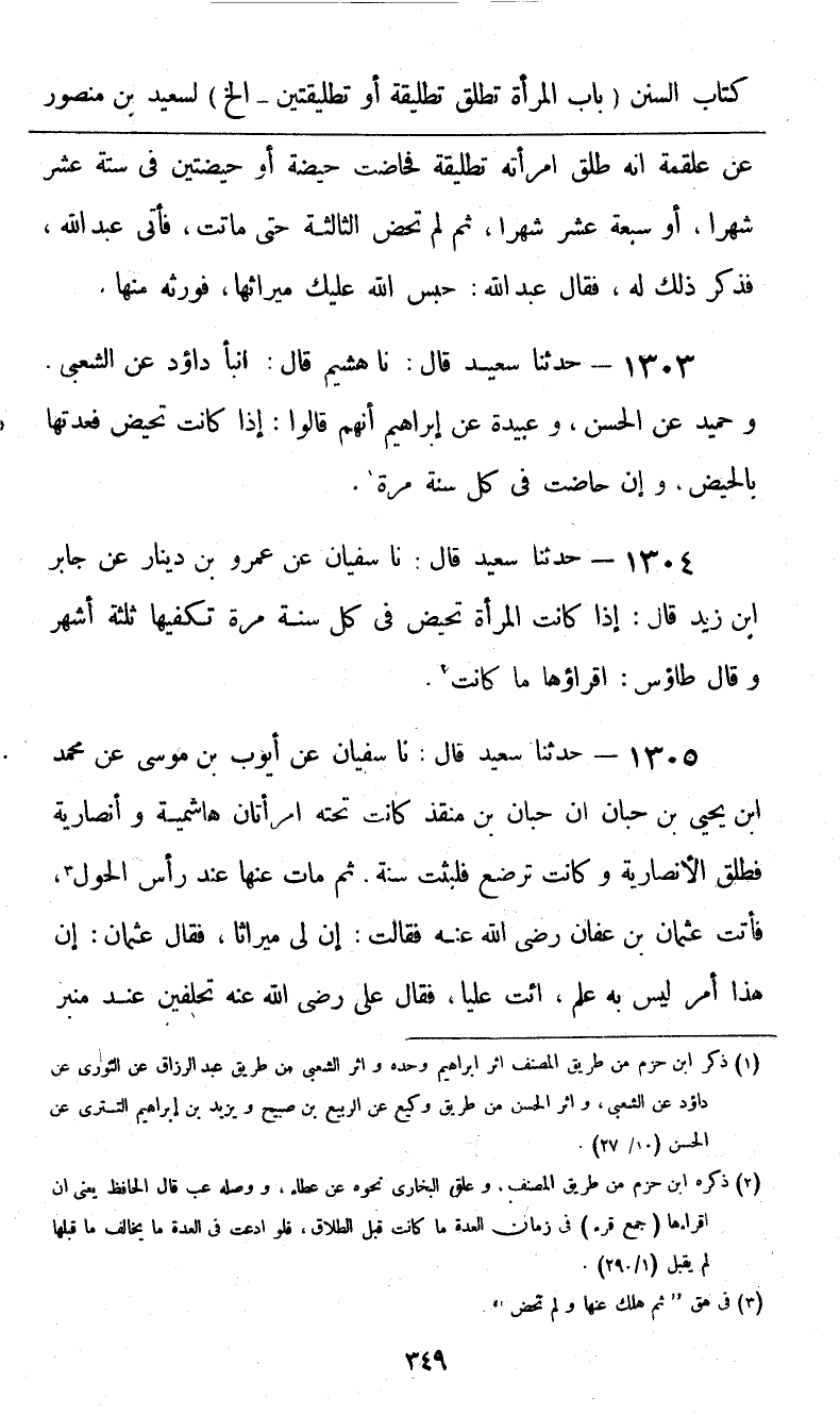 1303 - حَدَّثَنَا سَعِيدٌ قَالَ: نا هُشَيْمٌ، قَالَ: أَنْبَأَ دَاوُدُ، عَنِ الشَّعْبِيِّ، وَحُمَيْدٍ، عَنِ الْحَسَنِ، وَعُبَيْدَةَ، عَنْ إِبْرَاهِيمَ، أَنَّهُمْ قَالُوا: «§إِذَا كَانَتْ تَحِيضُ فَعِدَّتُهَا بِالْحَيْضِ وَإِنْ حَاضَتْ فِي كُلِّ سَنَةٍ مَرَّةً»