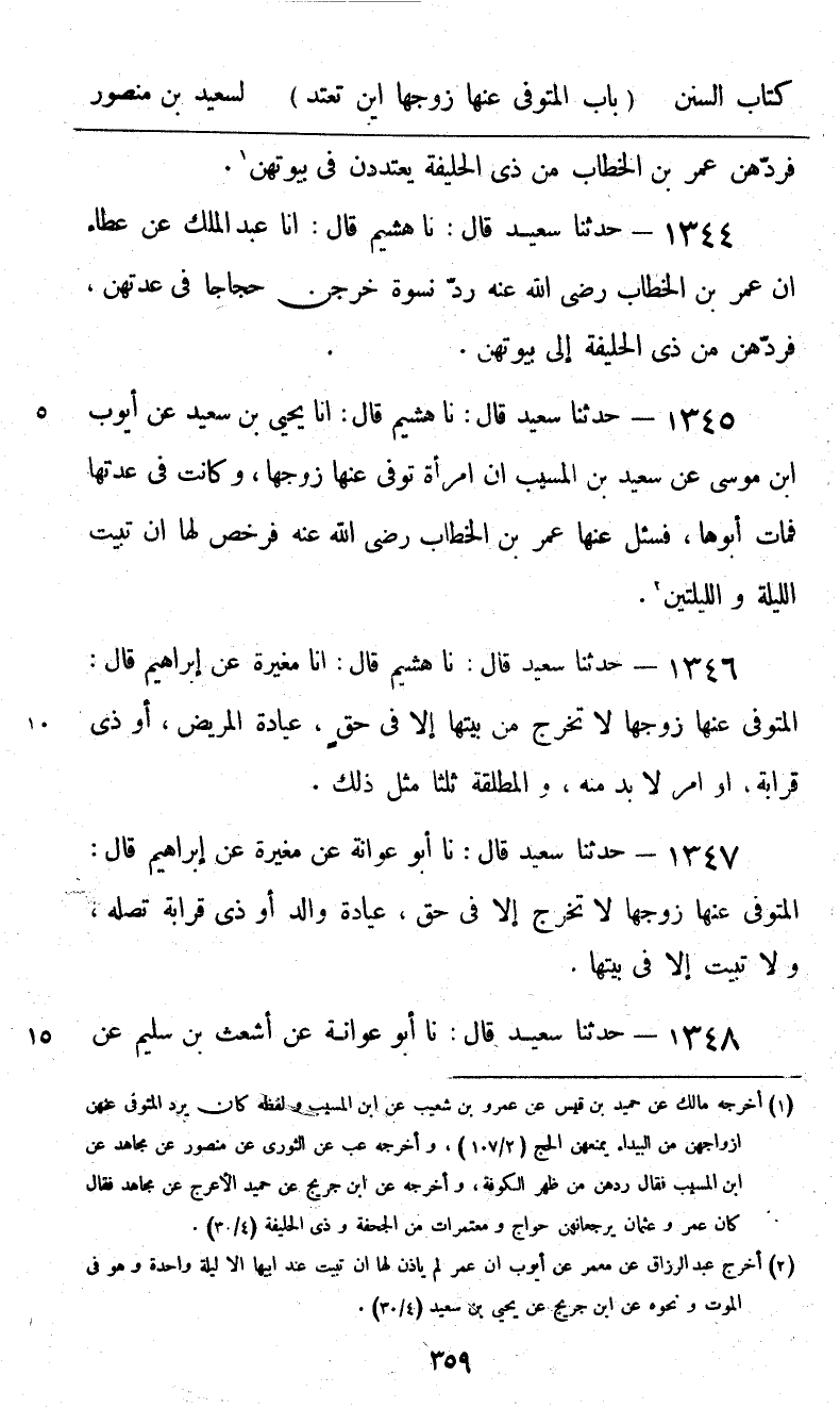1344 - حَدَّثَنَا سَعِيدٌ قَالَ: نا هُشَيْمٌ، قَالَ: أنا عَبْدُ الْمَلِكِ، عَنْ عَطَاءٍ، أَنَّ عُمَرَ بْنَ الْخَطَّابِ، رَضِيَ اللَّهُ عَنْهُ «§رَدَّ نِسْوَةً خَرَجْنَ حُجَّاجًا فِي عِدَّتِهِنَّ، فَرَدَّهُنَّ مِنْ ذِي الْحُلَيْفَةِ إِلَى بُيُوتِهِنَّ»