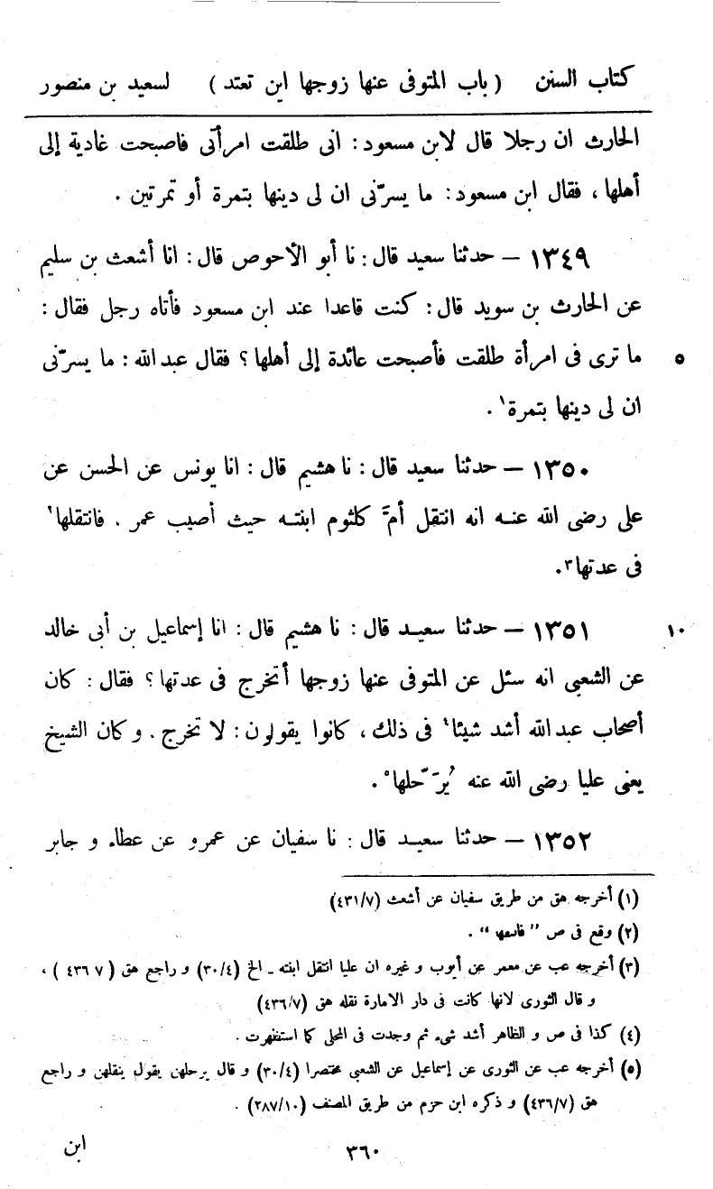1349 - حَدَّثَنَا سَعِيدٌ قَالَ: نا أَبُو الْأَحْوَصِ، قَالَ: أنا أَشْعَثُ بْنُ سُلَيْمٍ، عَنِ الْحَارِثِ بْنِ سُوَيْدٍ، قَالَ: كُنْتُ قَاعِدًا عِنْدَ ابْنِ مَسْعُودٍ، فَأَتَاهُ رَجُلٌ فَقَالَ: مَا تَرَى فِي امْرَأَةٍ طُلِّقَتْ، فَأَصْبَحَتْ عَائِدَةً إِلَى أَهْلِهَا؟ فَقَالَ عَبْدُ اللَّهِ: «§مَا يَسُرُّنِي أَنَّ لِي دِينَهَا بِتَمْرَةٍ»