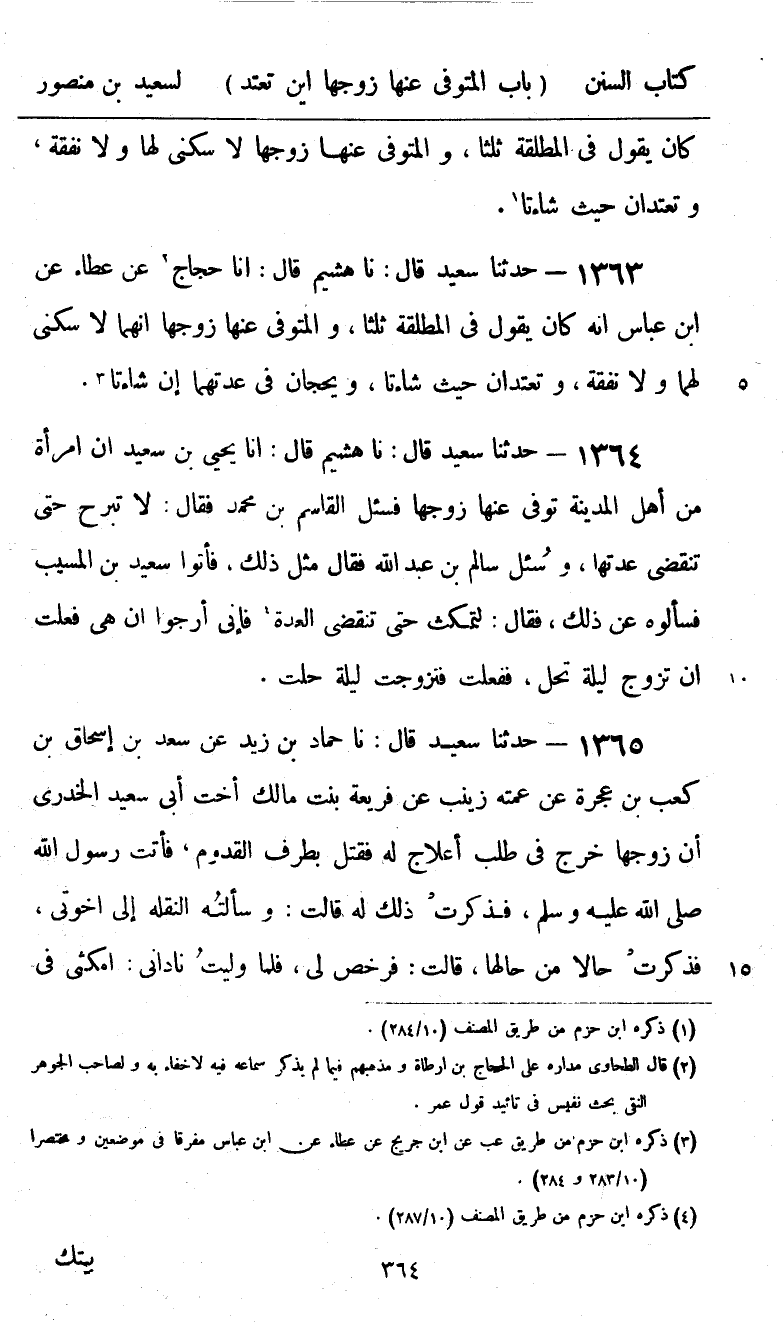 1364 - حَدَّثَنَا سَعِيدٌ قَالَ: نا هُشَيْمٌ، قَالَ: أنا يَحْيَى بْنُ سَعِيدٍ، أَنَّ امْرَأَةً مِنْ أَهْلِ الْمَدِينَةِ تُوُفِّيَ عَنْهَا زَوْجُهَا، فَسُئِلَ الْقَاسِمُ بْنُ مُحَمَّدٍ، فَقَالَ: لَا تَبْرَحُ حَتَّى تَنْقَضِيَ عِدَّتُهَا. وَسُئِلَ سَالِمُ بْنُ عَبْدِ اللَّهِ، فَقَالَ مِثْلَ ذَلِكَ، فَأَتَوْا سَعِيدَ بْنَ الْمُسَيِّبِ فَسَأَلُوهُ عَنْ ذَلِكَ، فَقَالَ: «§لِتَمْكُثْ حَتَّى تَنْقَضِيَ الْعِدَّةُ، فَإِنِّي أَرْجُو إِنْ هِيَ فَعَلَتْ أَنْ تَزَوَّجَ لَيْلَةَ تَحِلُّ. فَفَعَلَتْ، فَتَزَوَّجَتْ لَيْلَةَ حَلَّتْ»